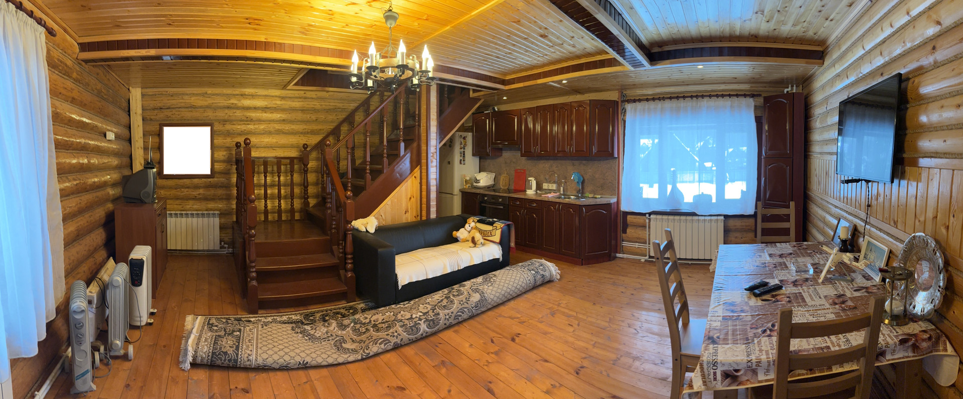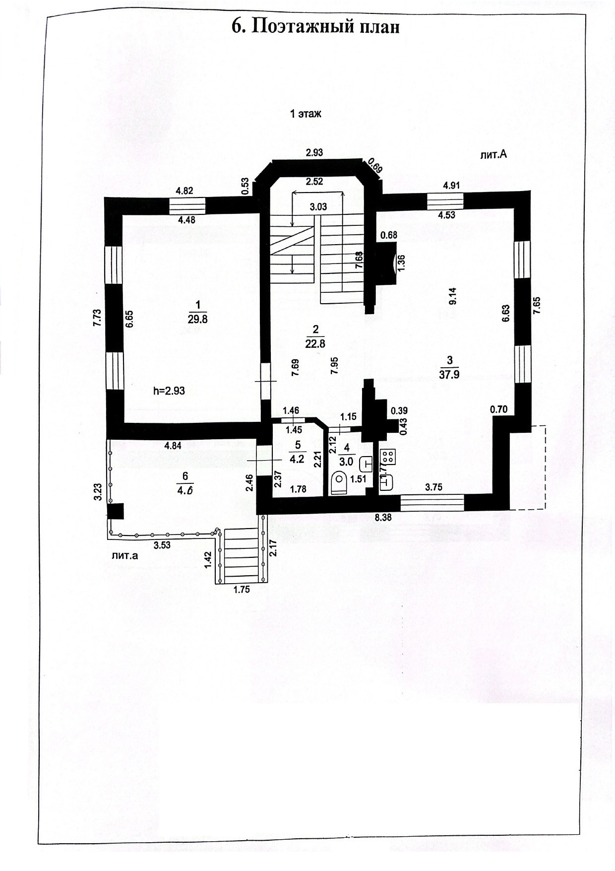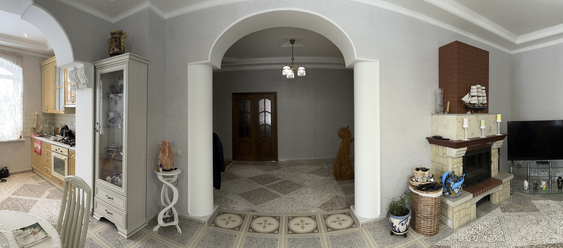 1 этаж: кухня-гостиная с действующим камином 37,9 м2, комната 29,8 м2, с/у 3м2, холл 22,8 м2. Высота 1 этажа 2,93 м. Полы с подогревом. Мебель на кухне.