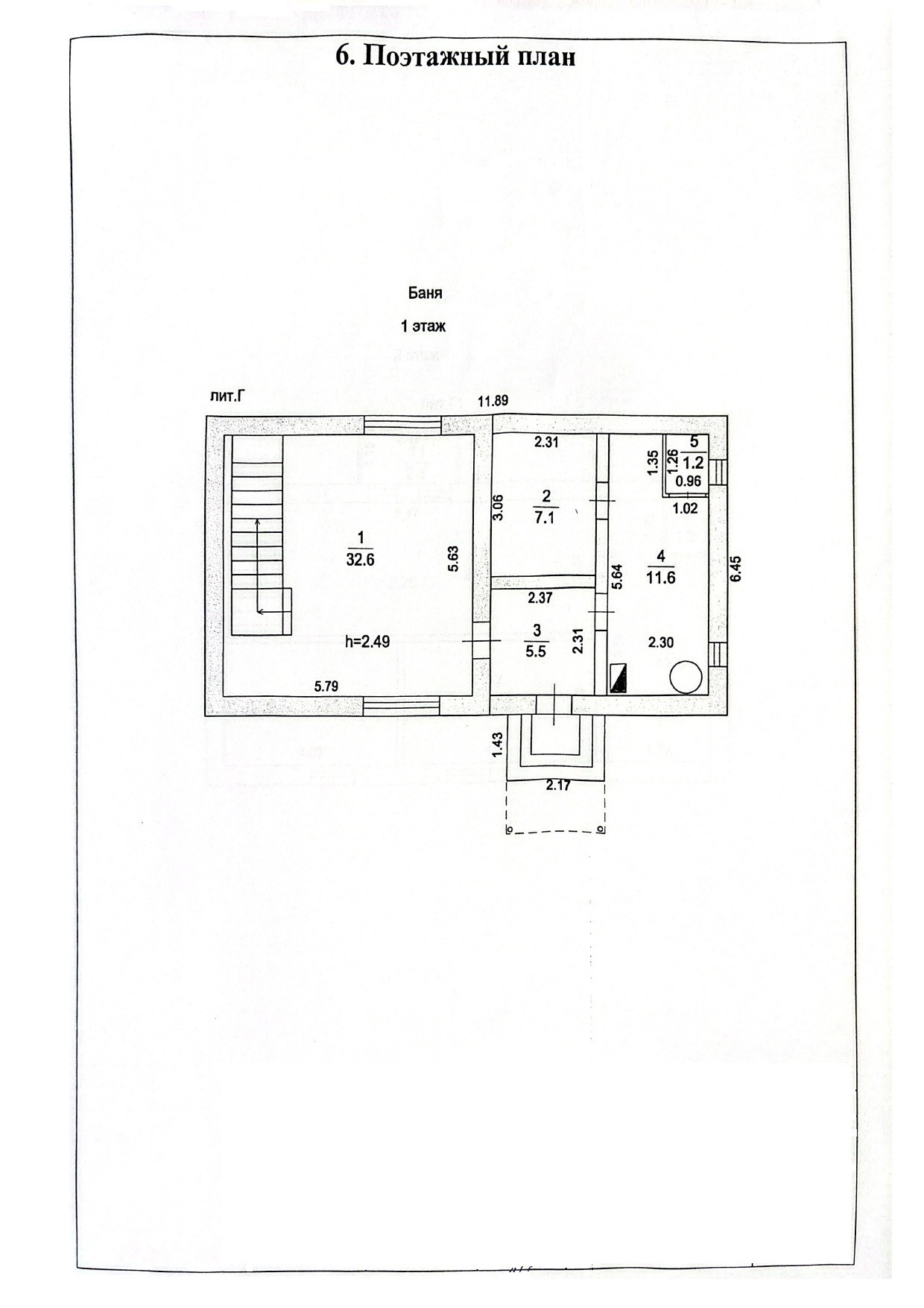 1 этаж: гостиная-кухня 32,6 м2, тех. помещение 11,6 м2, сауна 7,1 м2. Высота этажа 2,49 м.
