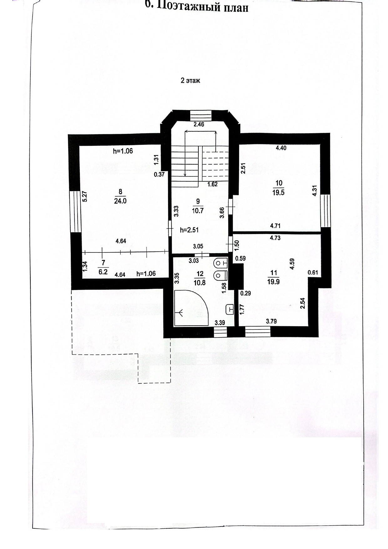 2 этаж: комната 19,5 м2, комната 19,9 м2, комната 30,2 м2 (встроенный шкаф 6,2 м2) , с/у 10,8 м2, холл 10,7 м2. Высота этажа 2,51 м.