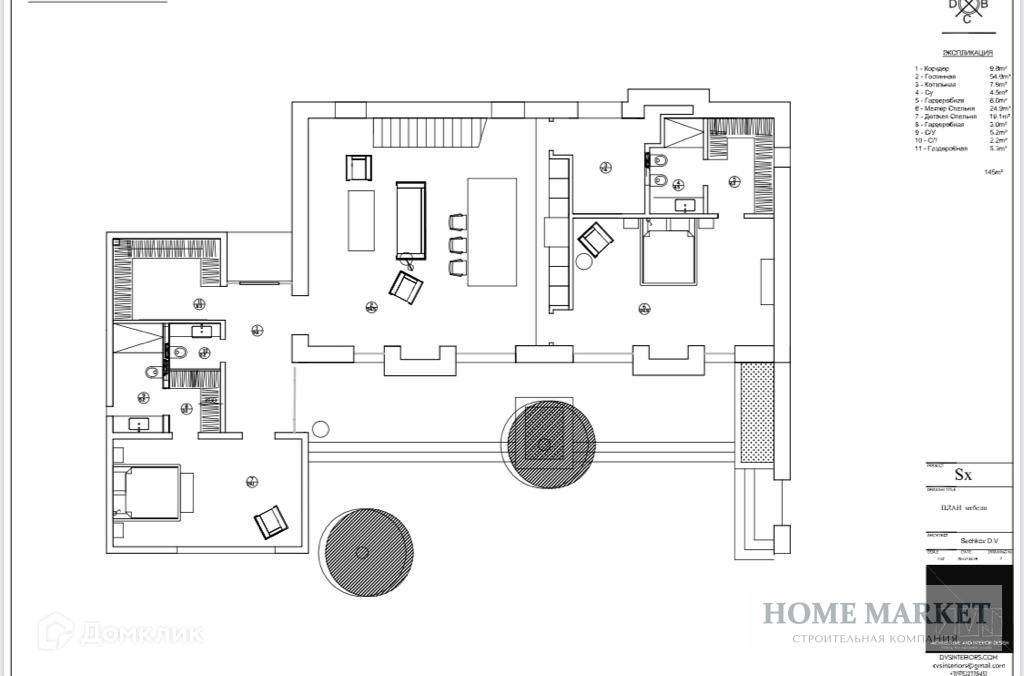 1 этаж: холл, просторная кухня-гостиная (54 кв.м) со вторым светом и с выходом на большую террасу, мастер-спальня 24.9 кв.м. с ванной комнатой и гардеробной, гостевая спальня, гардеробная, санузел, вместительная кладовая, котельная 7.5 кв.м.;
