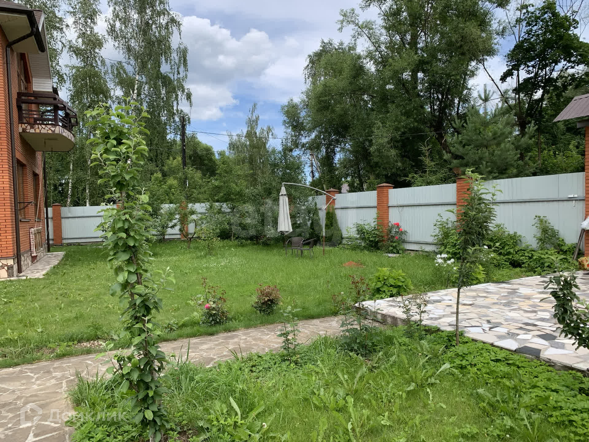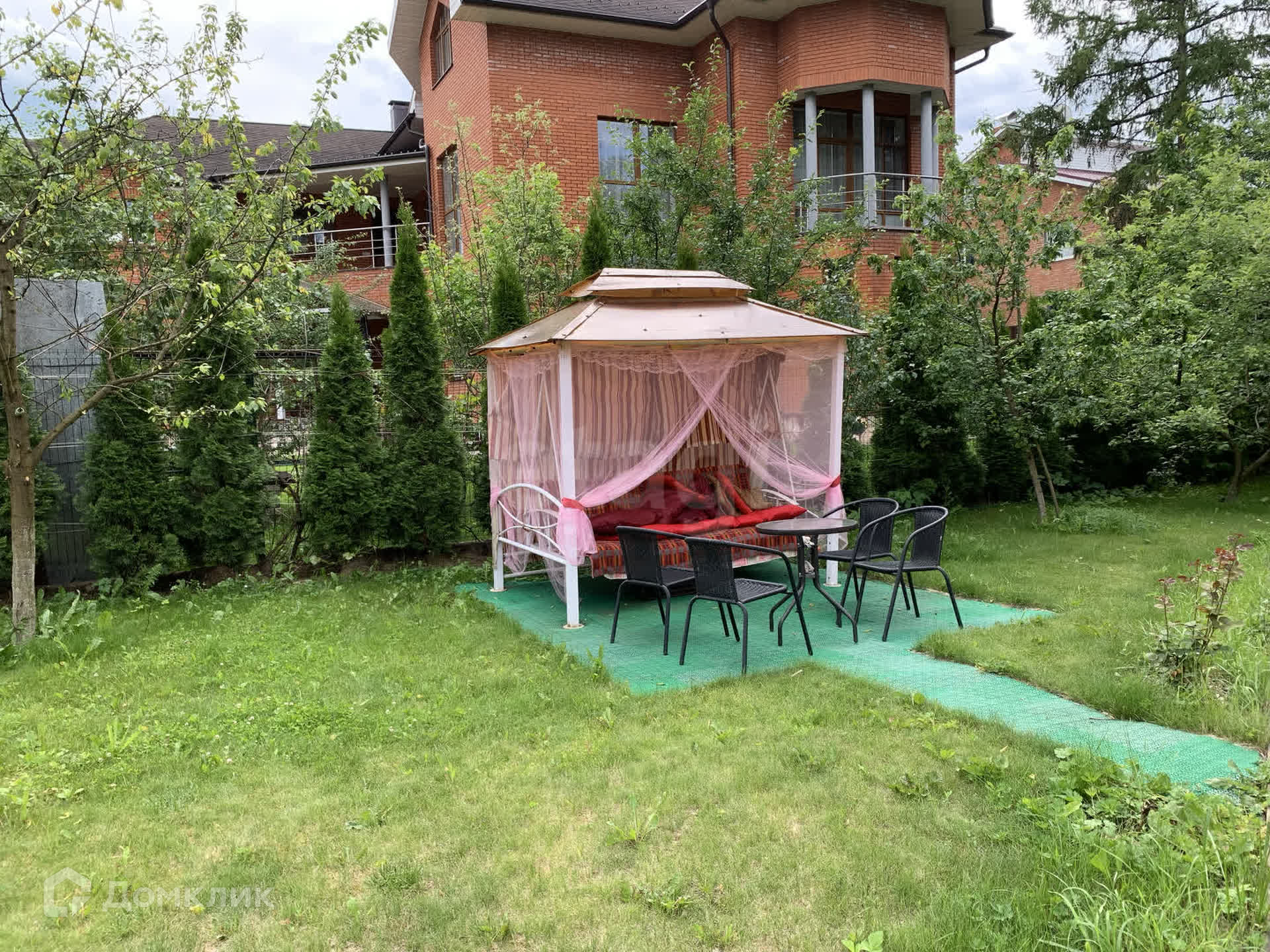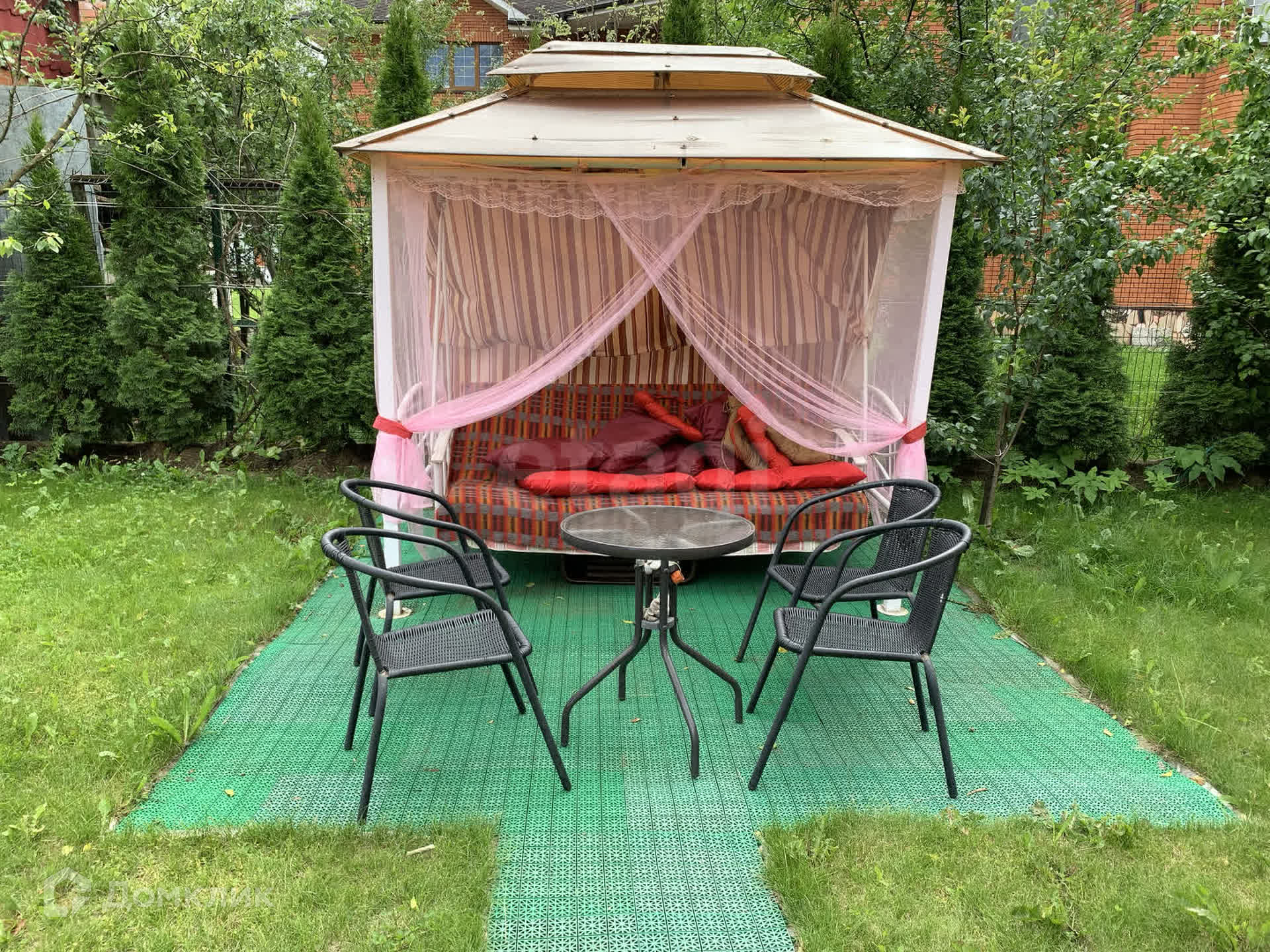 На участке правильно ухоженный газон, зона патио и шезлонги.