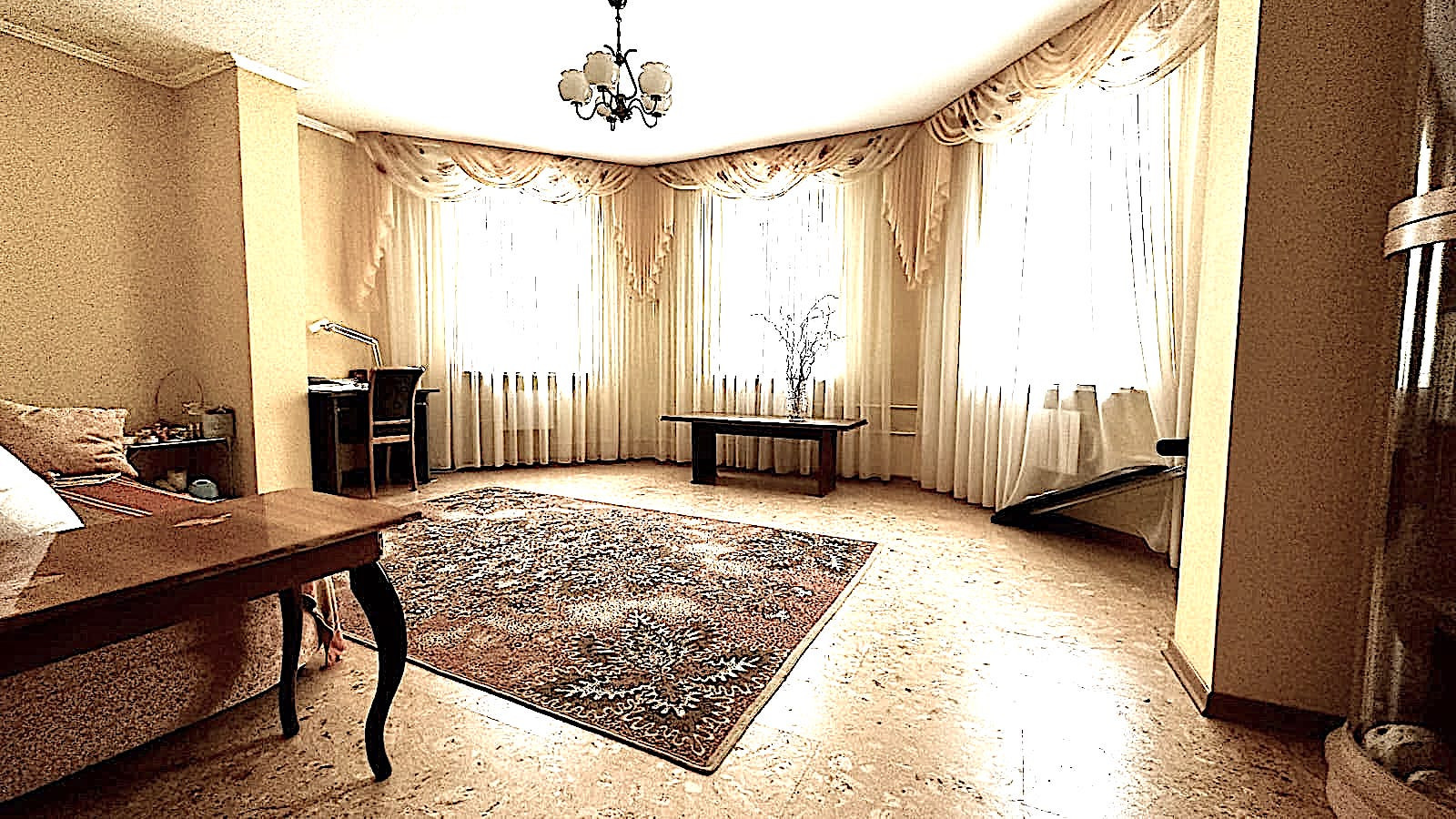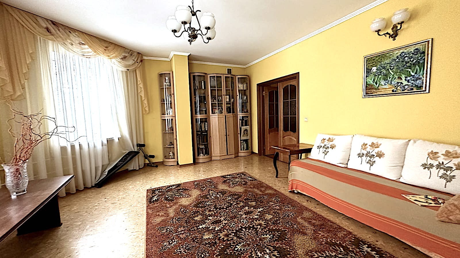 На первом этаже размером 150м.кв. располагаются просторная прихожая 25 м.кв., великолепная, просторная кухня-столовая 25 метров, с итальянским кухонным гарнитуром из массива дерева, роскошная гостиная комната размером 48 метров, две жилые комнаты,из одной можно оборудовать под гардеробную с окном, мечта любой женщины. Зимний сад и сан узел. На всем первом этаже полы с подогревом.