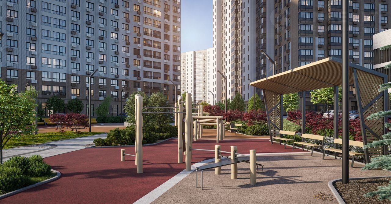 Дворы без машин. Безопасные детские площадки. Вдоль корпусов организованы зоны тихого отдыха: детский гомон с далеких каруселей и горок не достигнет окон жителей. В квартале спроектирован закольцованный веломаршрут с понятной навигацией и парковками для двухколесного транспорта.