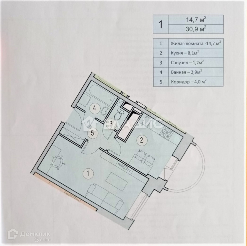 Общая площадь 30.9 м2