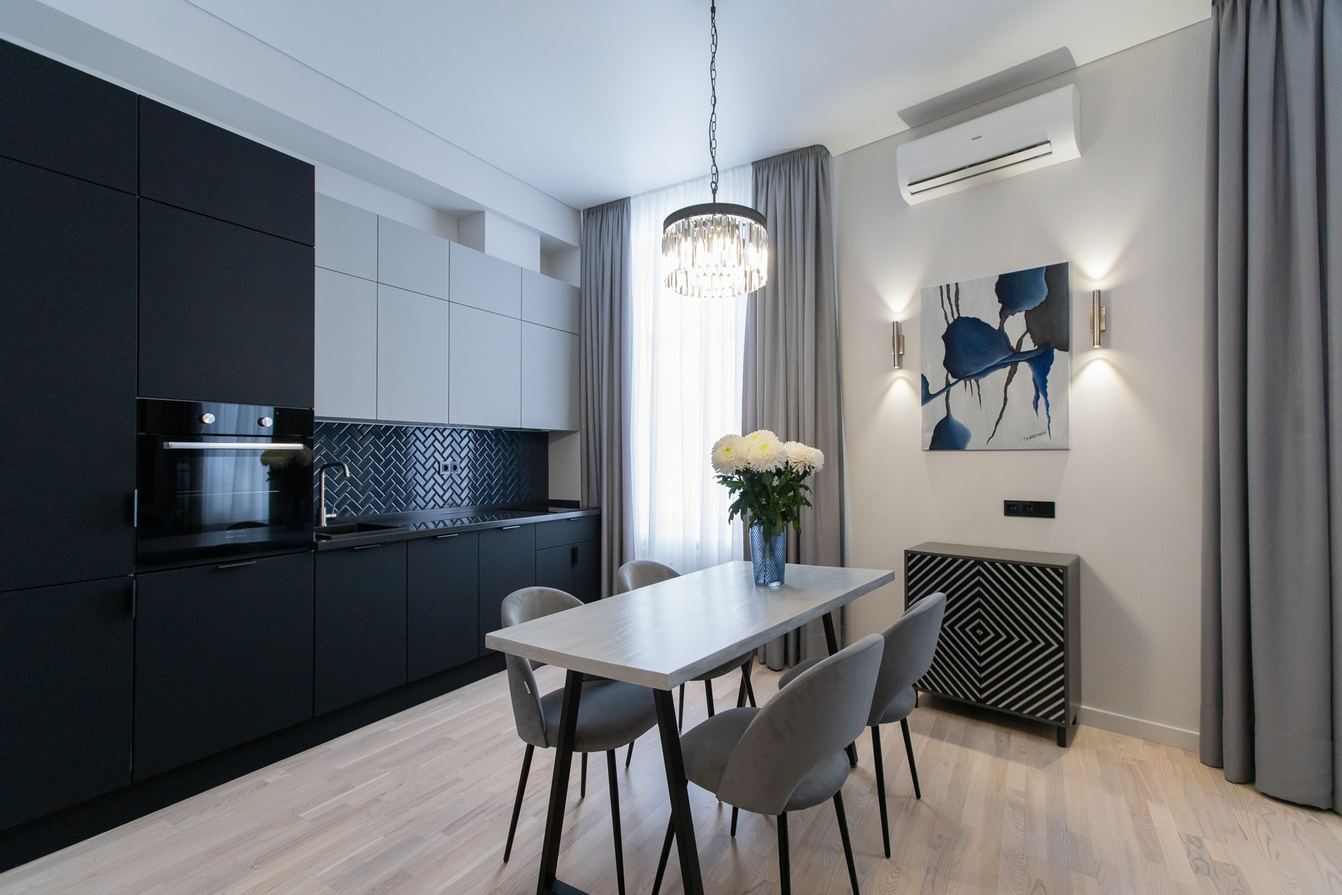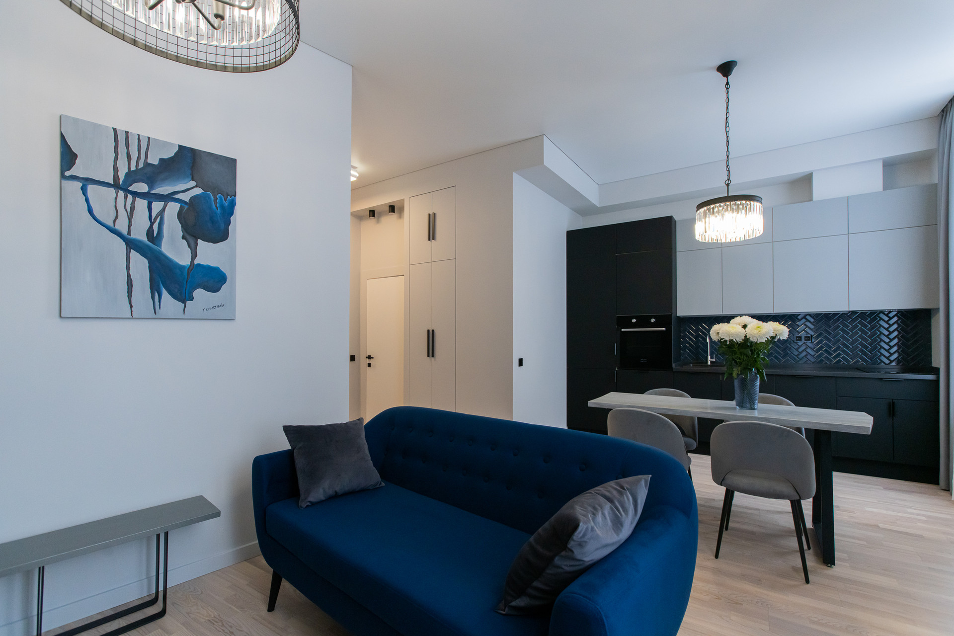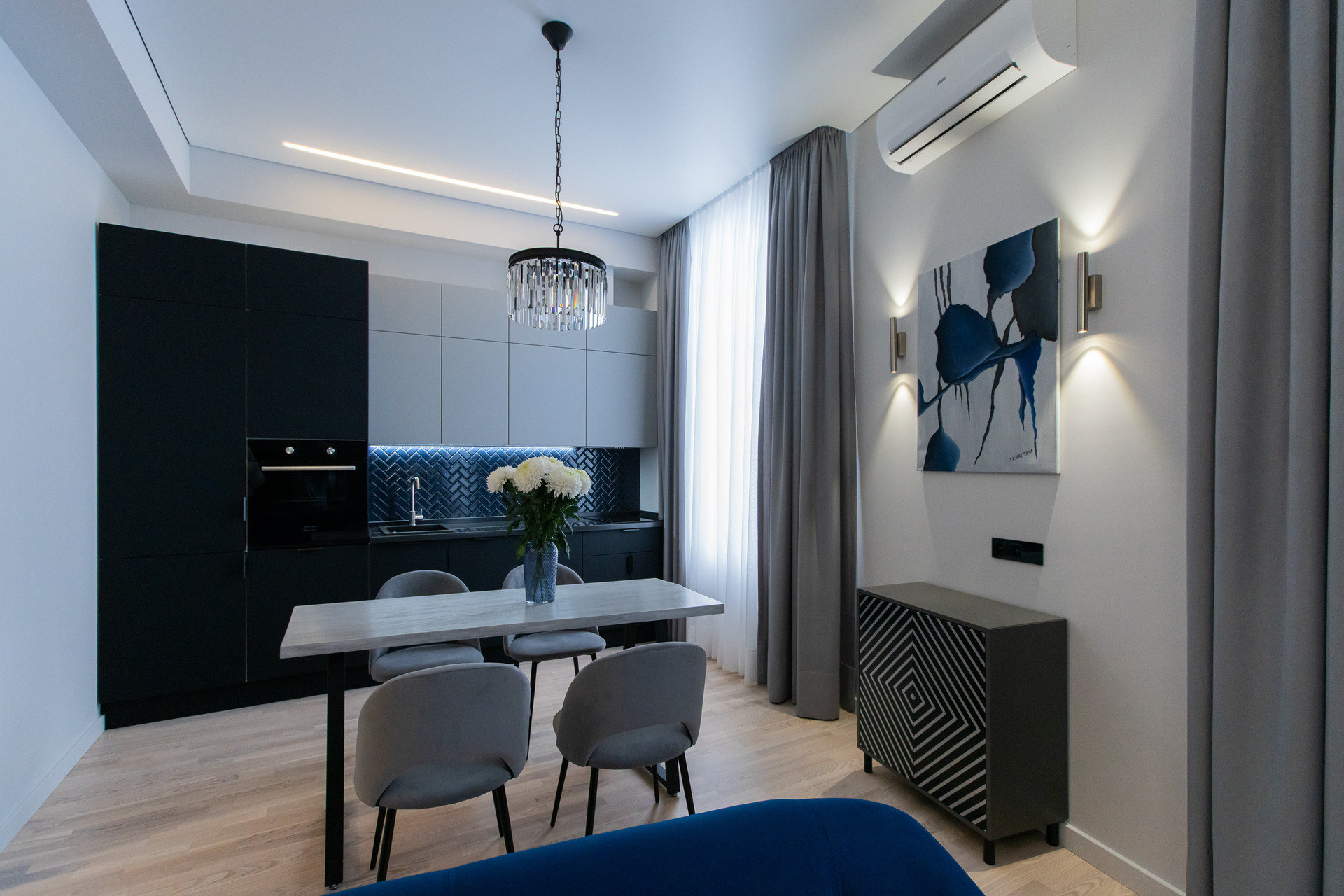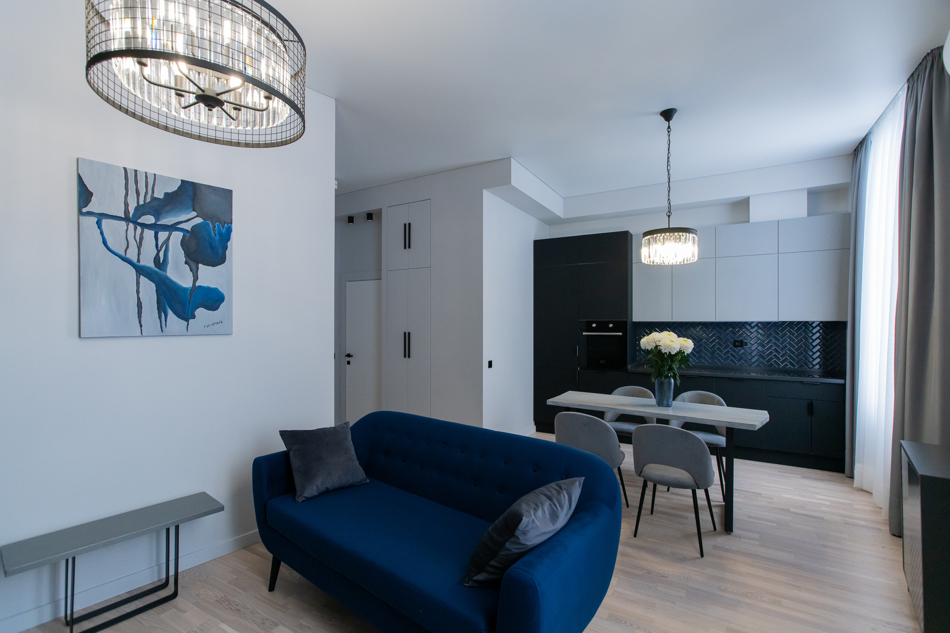 Квартира с функциональной планировкой; кухня-гостиная, спальня, просторная ванная комната, балкон. Дизайнерский свет и мебель.