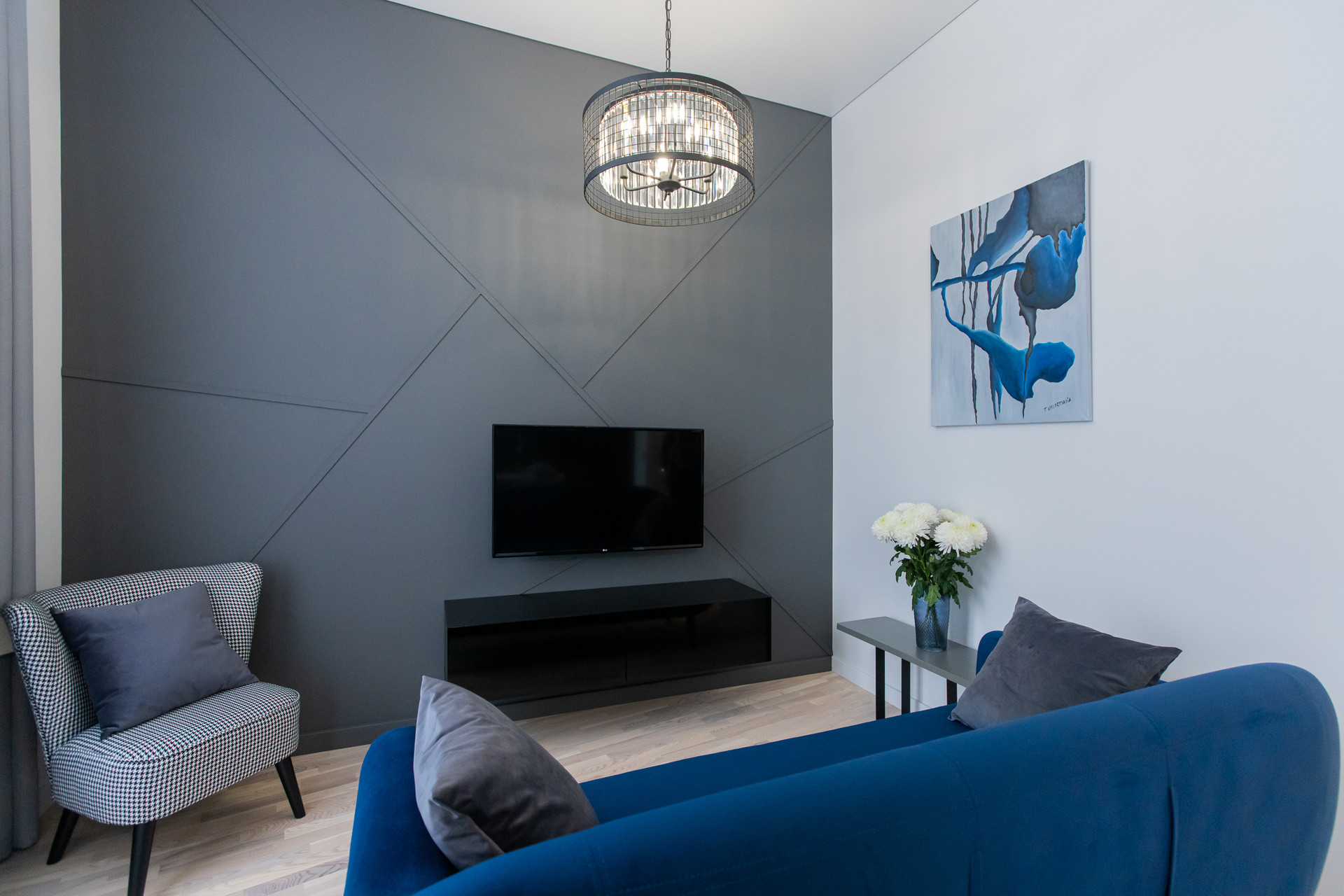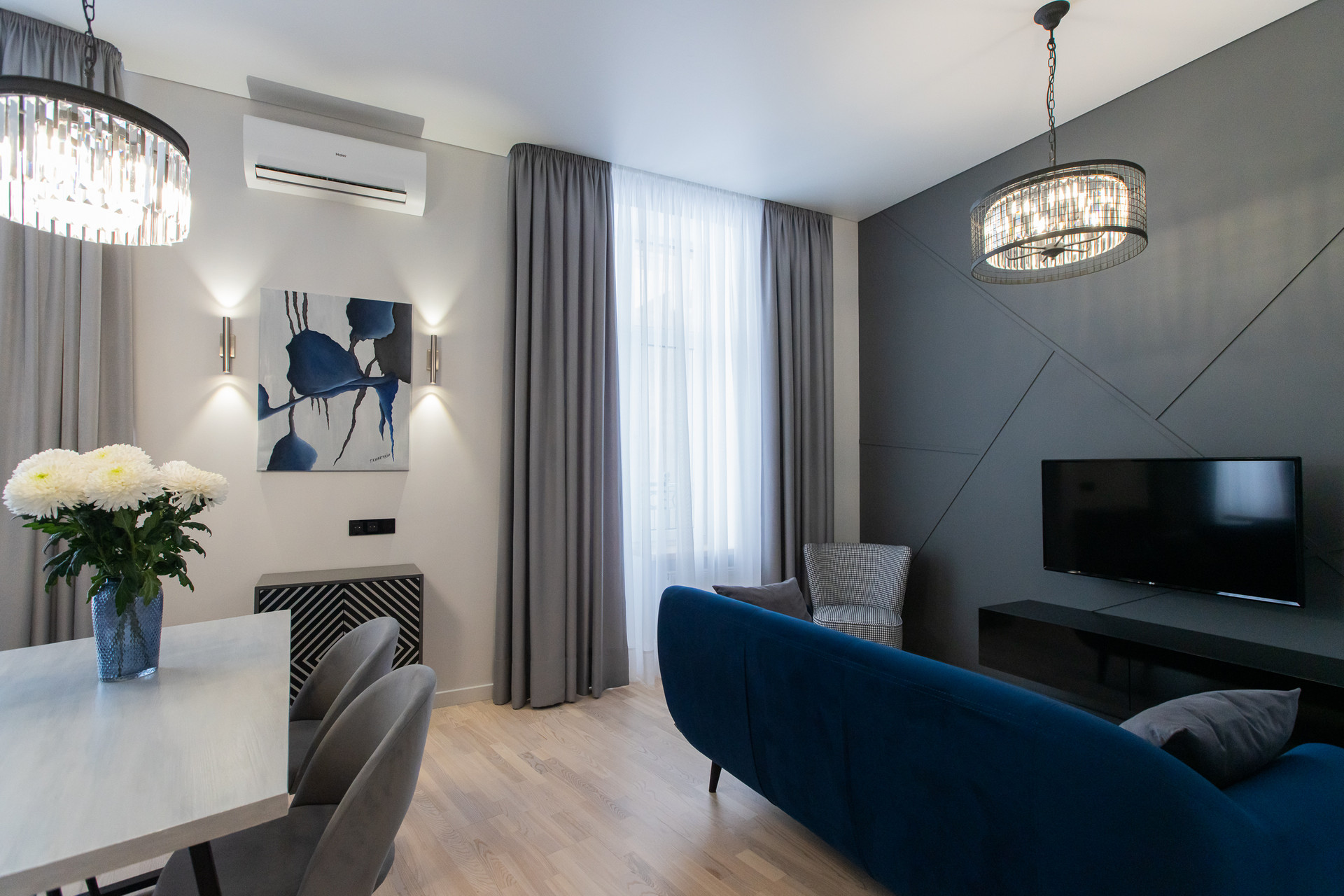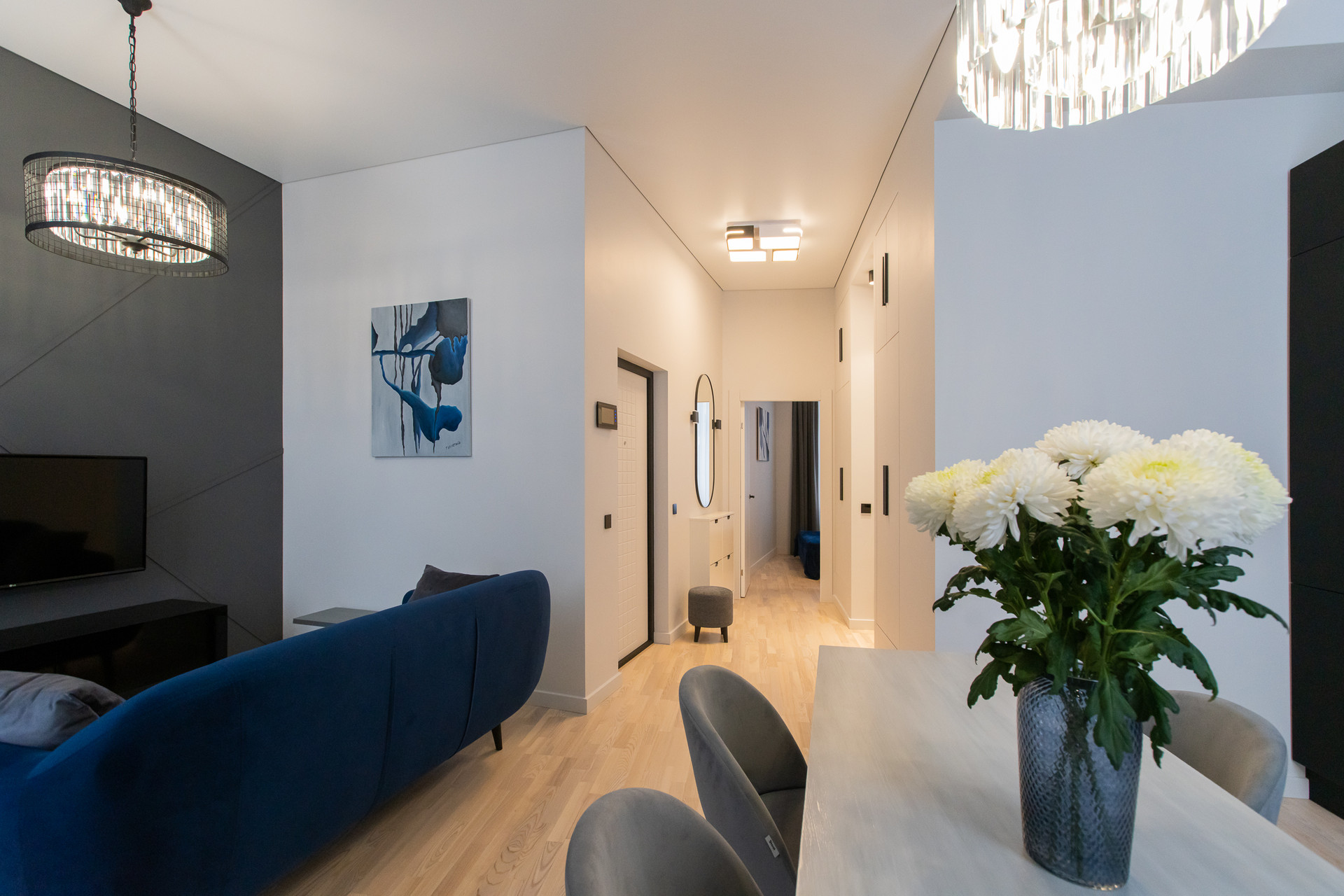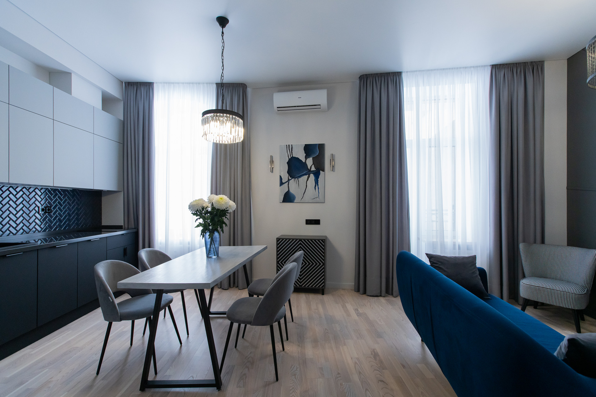 Квартира с функциональной планировкой; кухня-гостиная, спальня, просторная ванная комната, балкон. Дизайнерский свет и мебель.