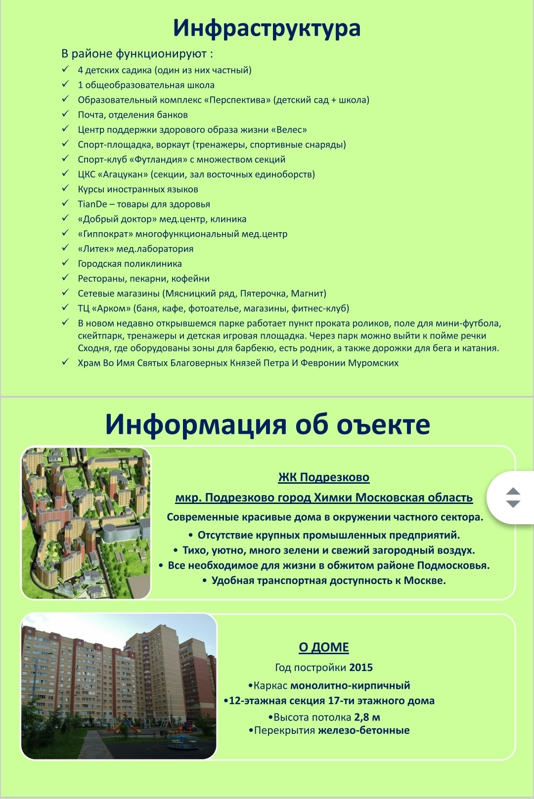 ###Добавьте объявление в избранное,чтобы не потерять ###       Продается квартира студия .                  На 1 этаже 12 этажного дома.                       Дом 2015 года,кирпичный.                                      Ж/Д Подрезково- 8 минут пешком.          ОТЛИЧНЫЙ ВАРИАНТ .      Зеленый ,тихий спальный район.Прекрасный парк для прогулок и отдыха.                                    Записывайтесь на просмотр.Звоните ☎.     АКЦИЯ ПО ЦЕНЕ ДО 31 ОКТЯБРЯ!!!!!