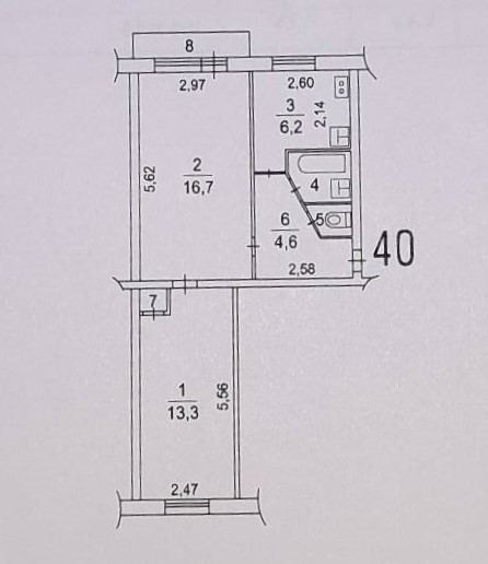 Общая площадь 44.3 м2