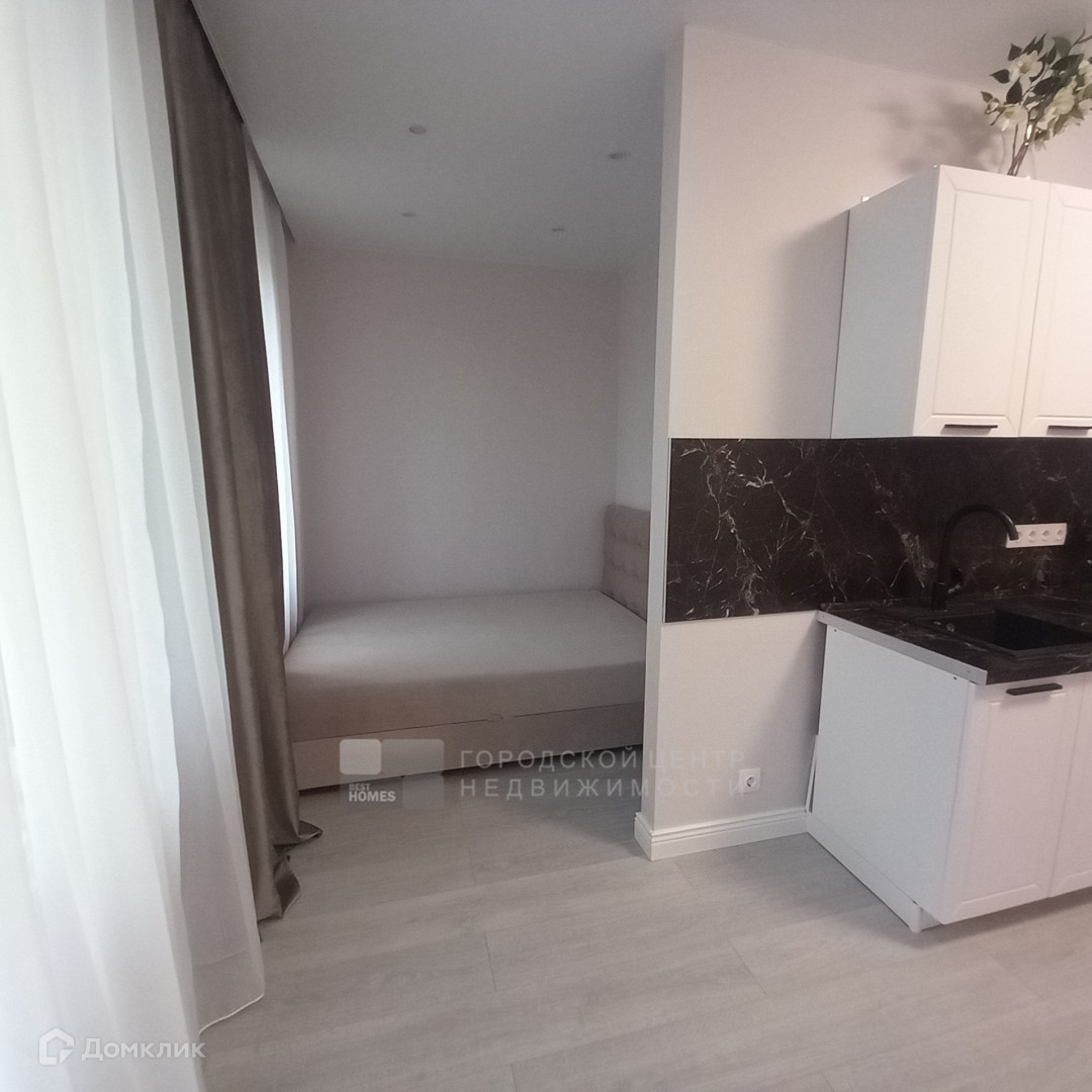 Светлая студия с выделенной зоной спальни 27,7 кв.м.  Квартира расположена на 15 этаже 17- этажного дома.  Квартира выполнена качественными дорогими материалами, укомплектована современной бытовой техникой и мебелью.