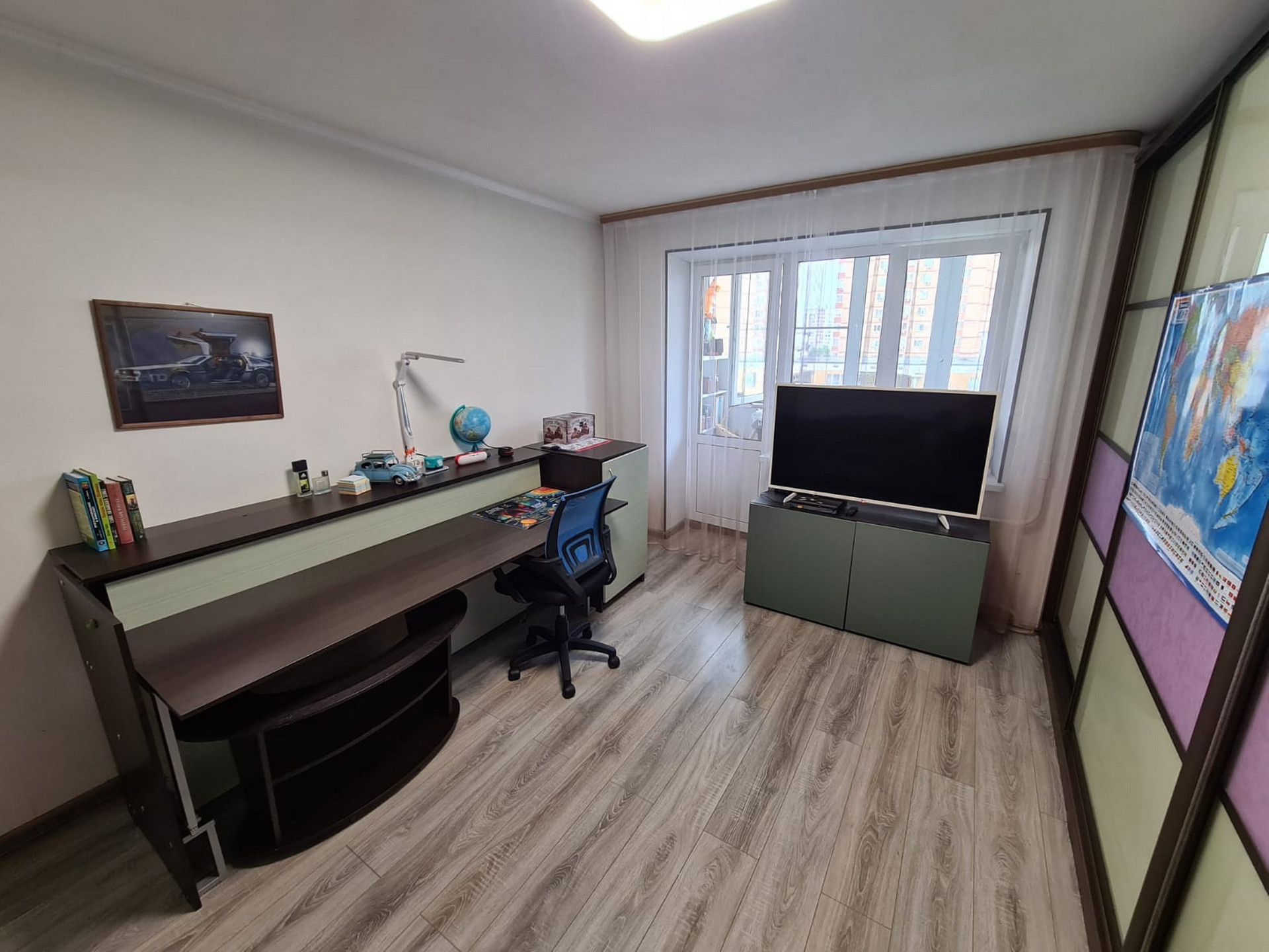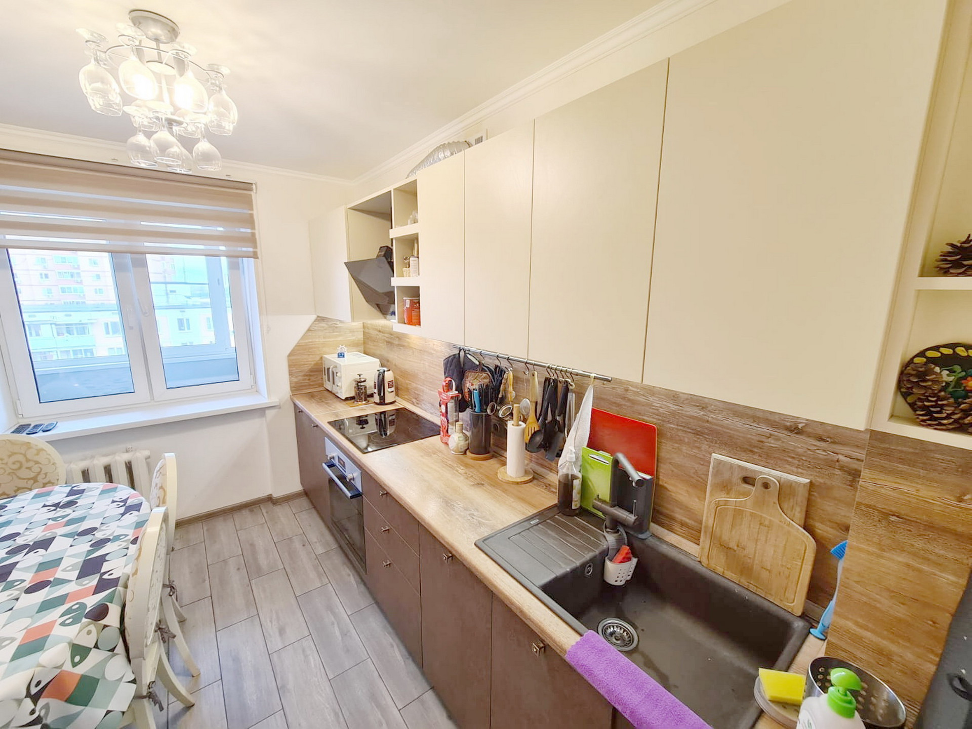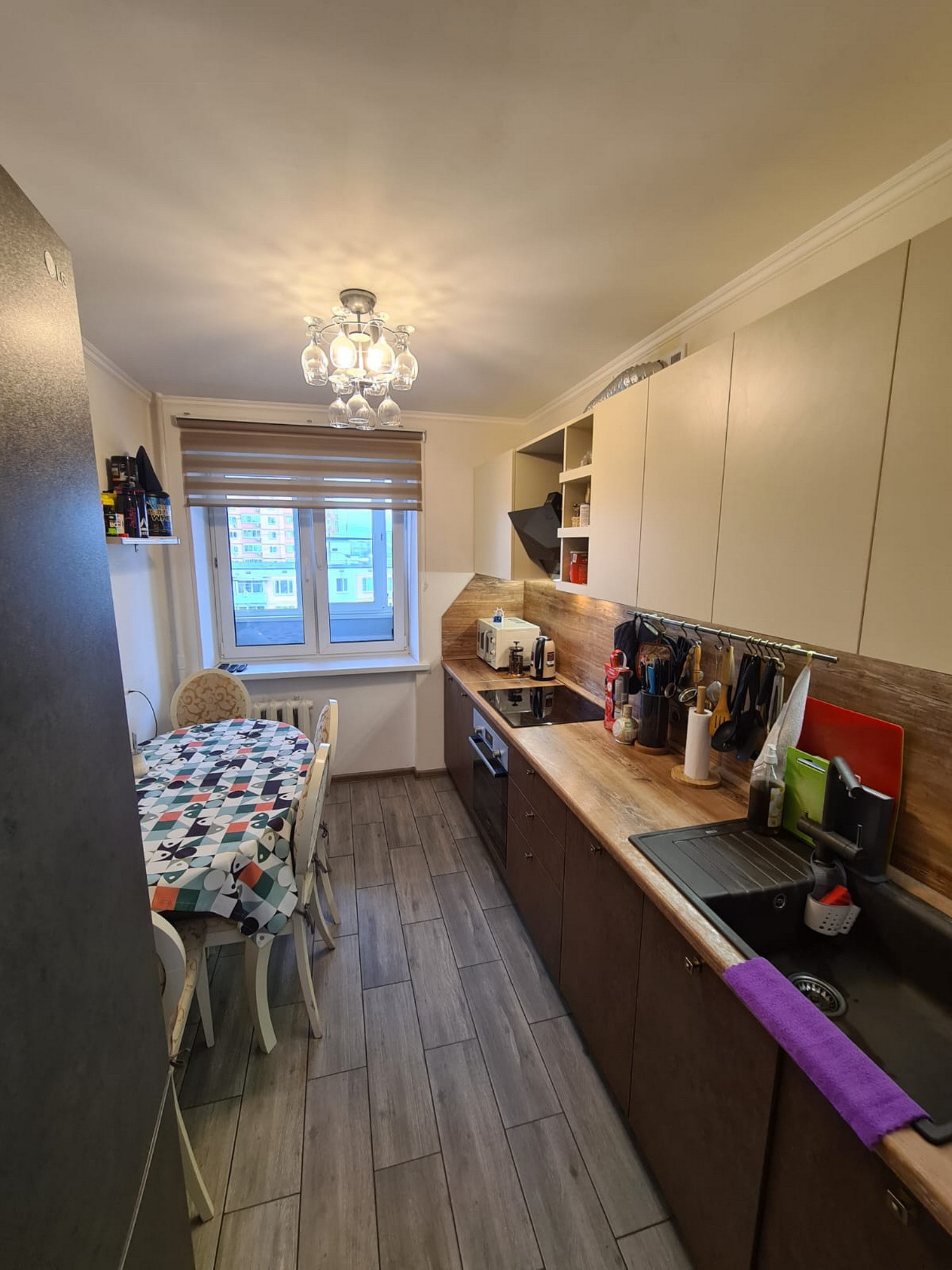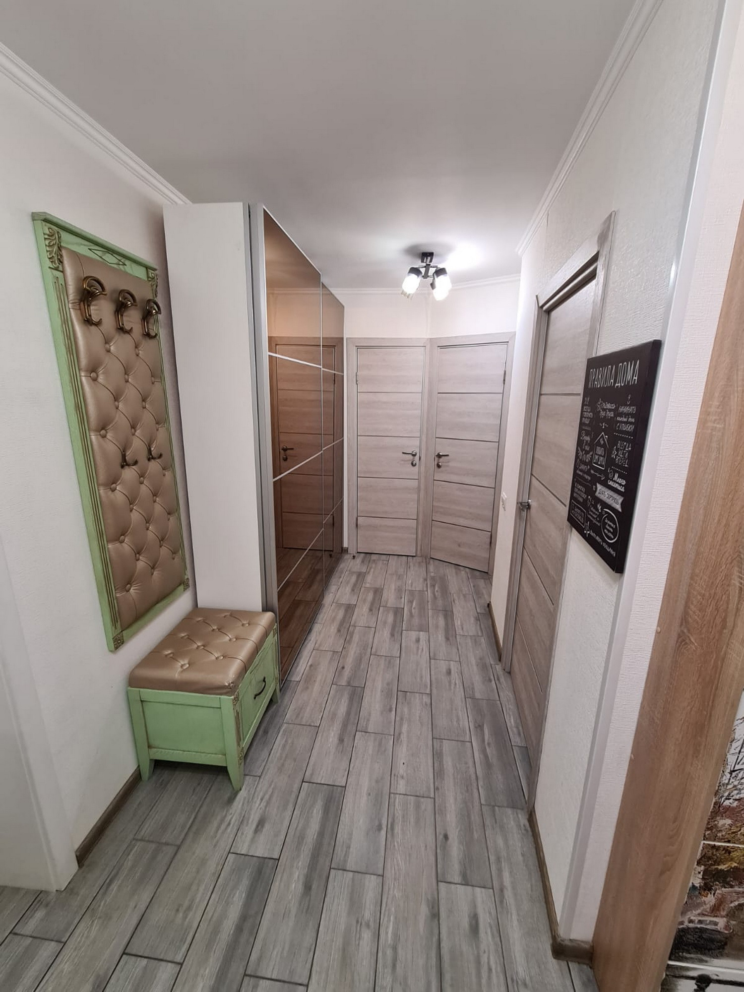 Квартира состоит из: кухни – 8 кв.м, просторного коридора – 7 кв.м, раздельных комнат: зала – 18 кв.м. и спальни- 12 кв.м, раздельного санузла, есть большая вместительная лоджия с панорамным видом. Квартира очень светлая и уютная, продуманная планировка. Хороший чистый подъезд. Порядочные соседи. Что немаловажно. Во дворе есть стихийная парковка, но всегда есть место, где припарковаться.