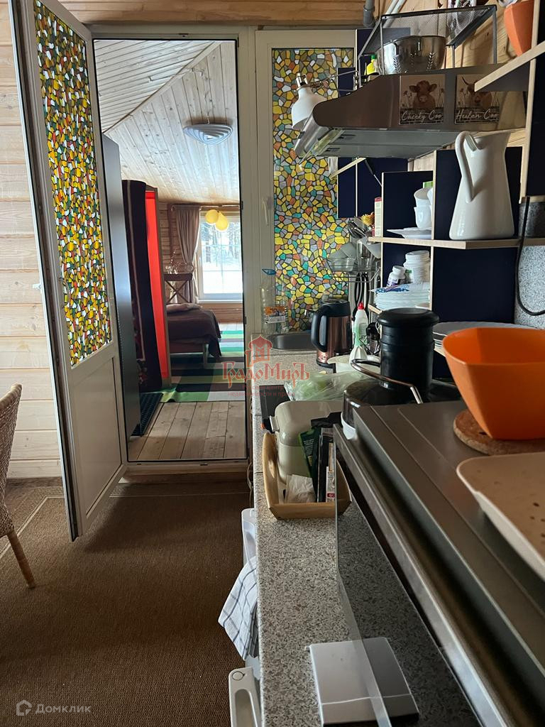 1 этаж: отапливаемая светлая веранда из профилированного бруса 40 м2, сверху покрыта прозрачным поликарбонатом, застеклённая тремя двухкамерными стеклопакетами, с выходом и видом на смешанный лес, а также имеет 2 входа в дом, прихожая, кухня, 2 комнаты - гостиная 35м2 с камином и спальня 20 м2, 2 санузла: 1 туалет, уборная с душевой кабиной и гардеробная, раздевалка, 2 кухни 12 м2 и 14 м2.