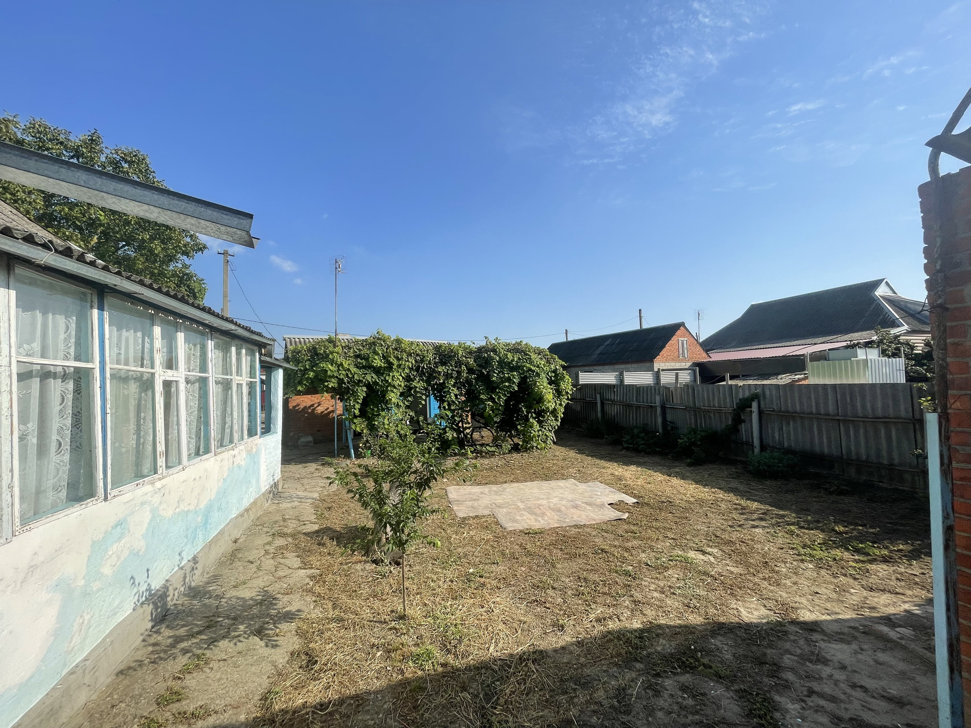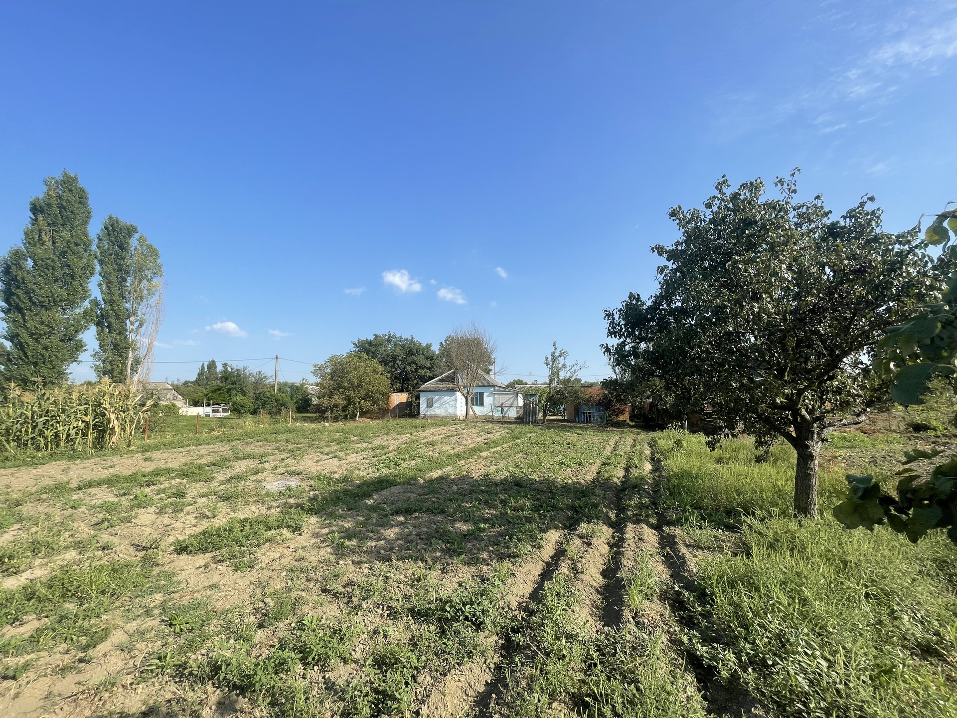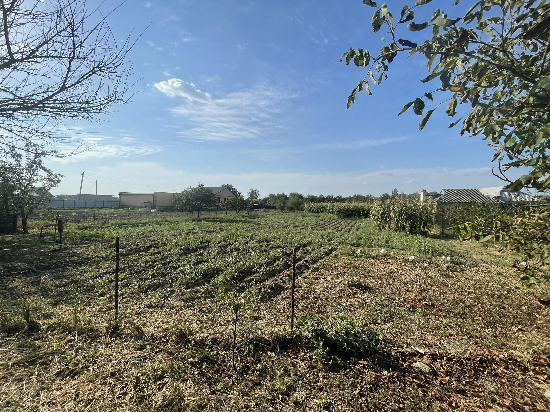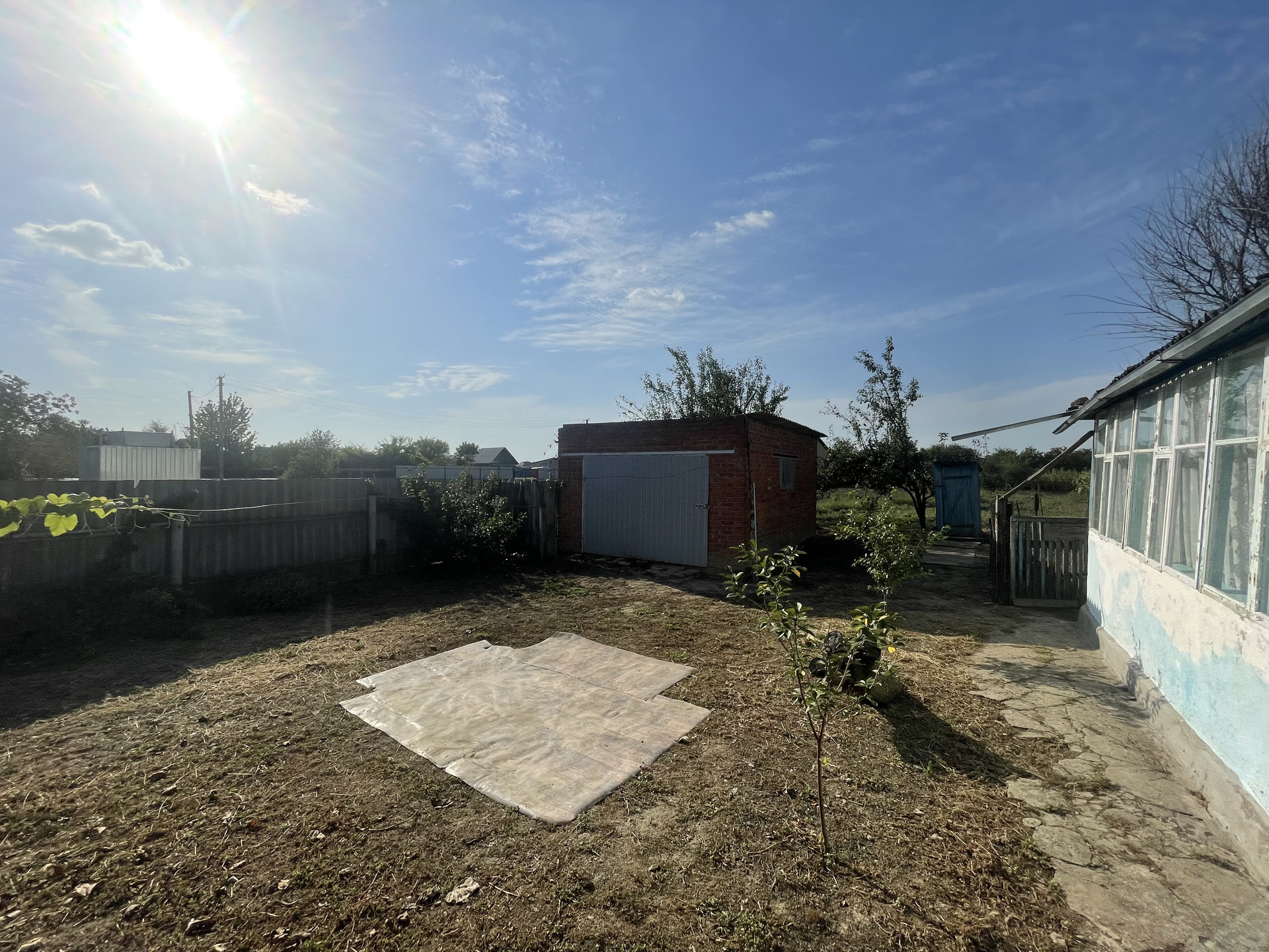 На участке гараж, блочные хоз. постройки, артезианская скважина - 10 м., насосная колонка (металлическая), мощение (железобетонные плиты), растут фруктовые деревья, виноградная беседка, забор металлопрофиль.