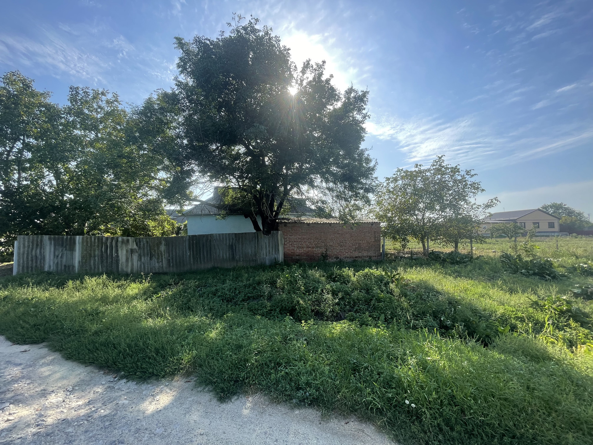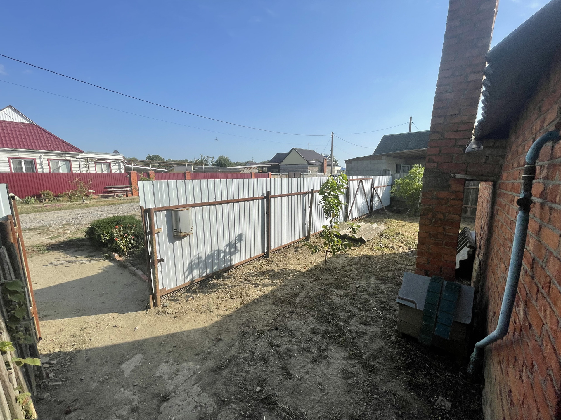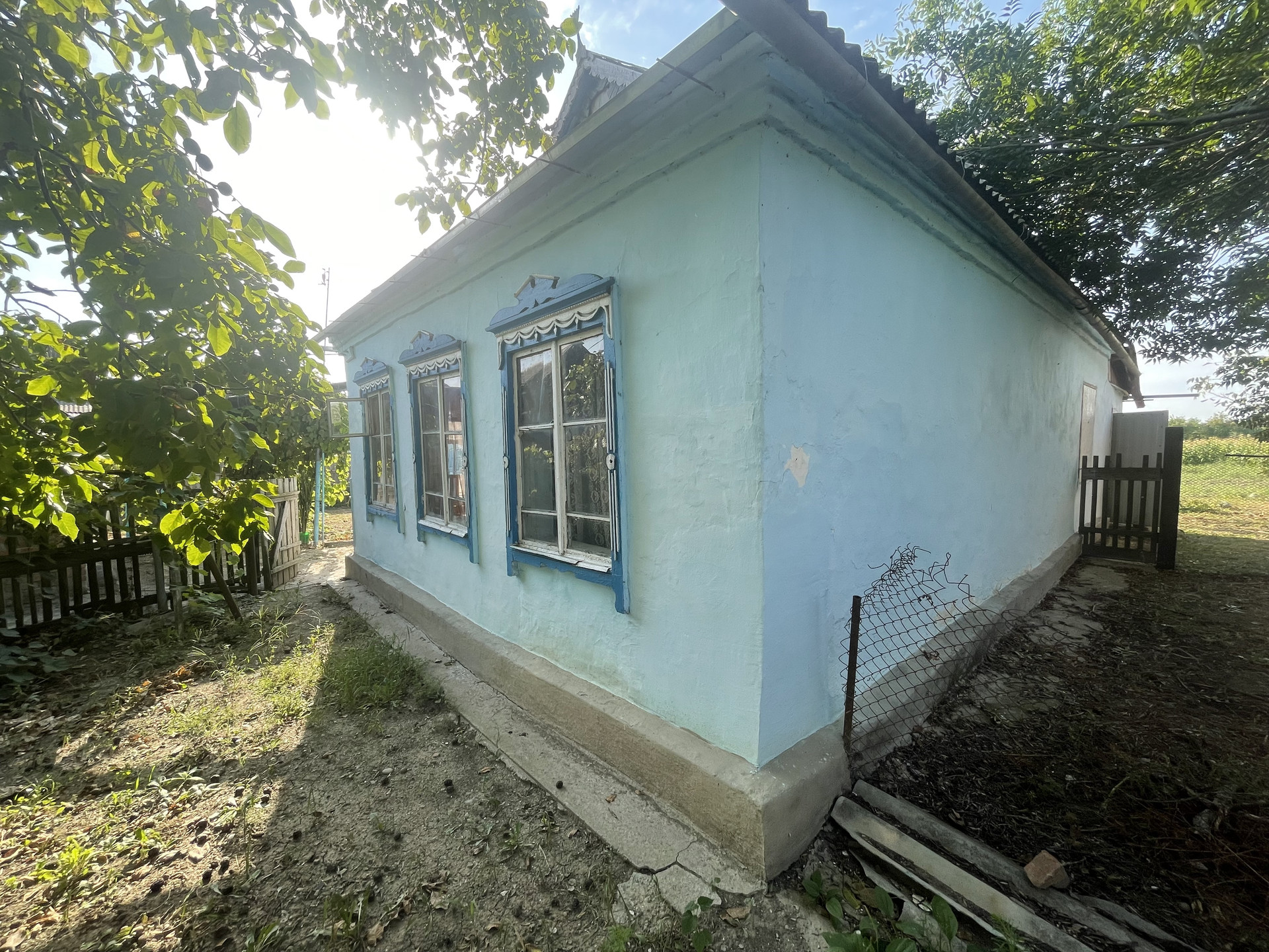На участке гараж, блочные хоз. постройки, артезианская скважина - 10 м., насосная колонка (металлическая), мощение (железобетонные плиты), растут фруктовые деревья, виноградная беседка, забор металлопрофиль.