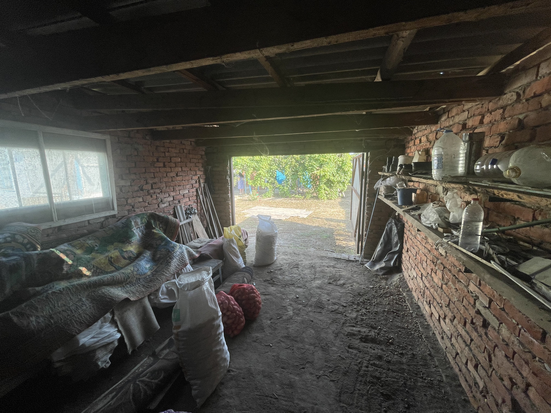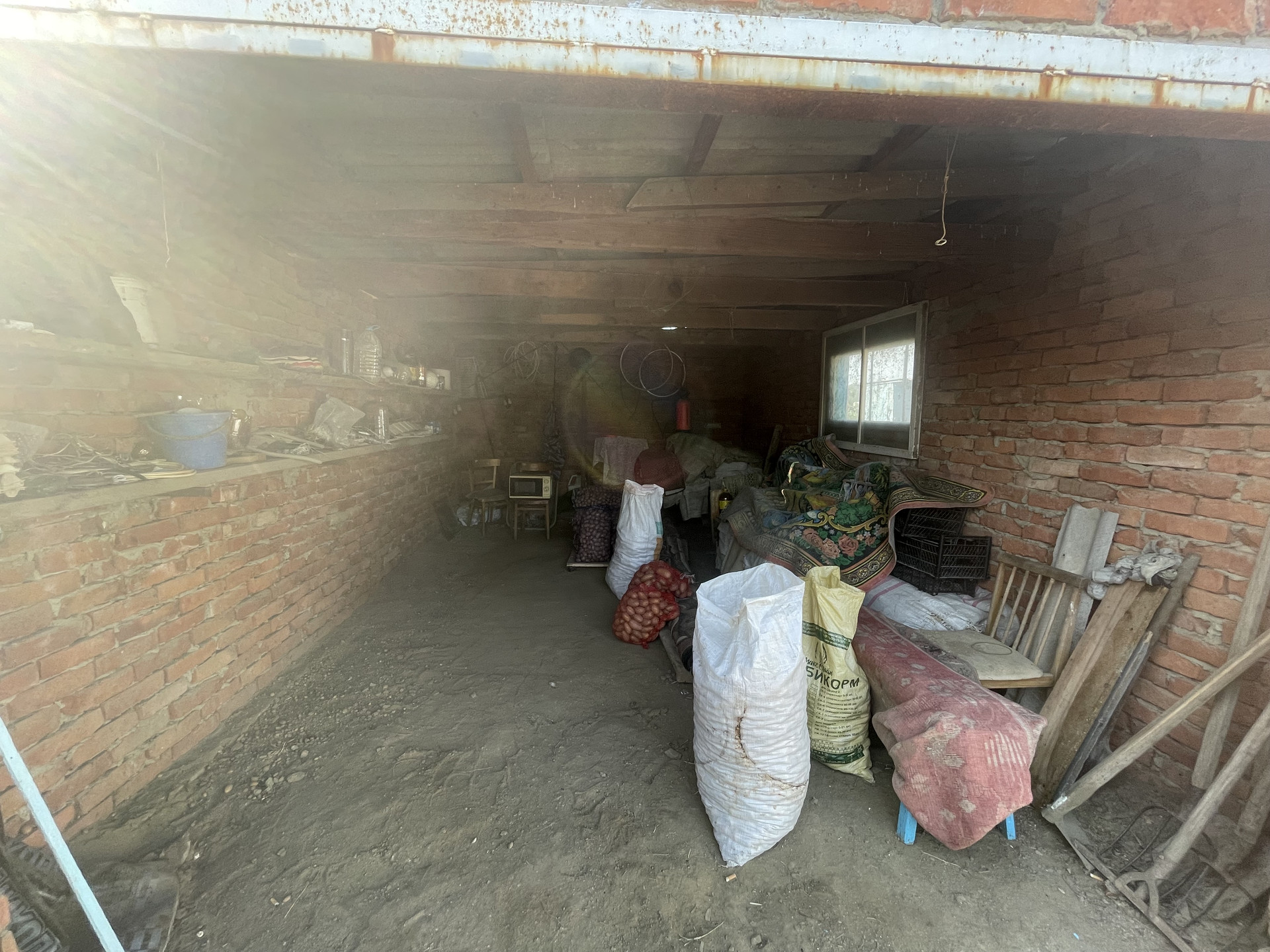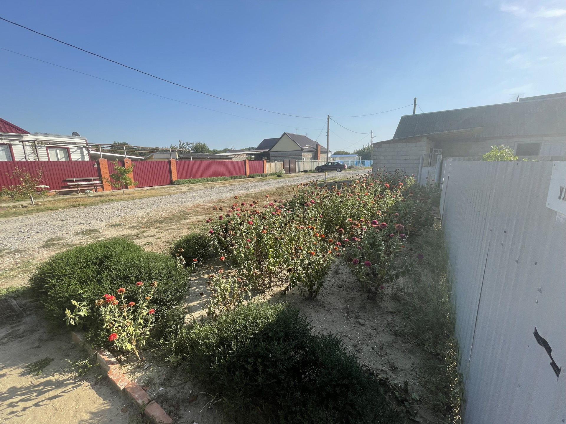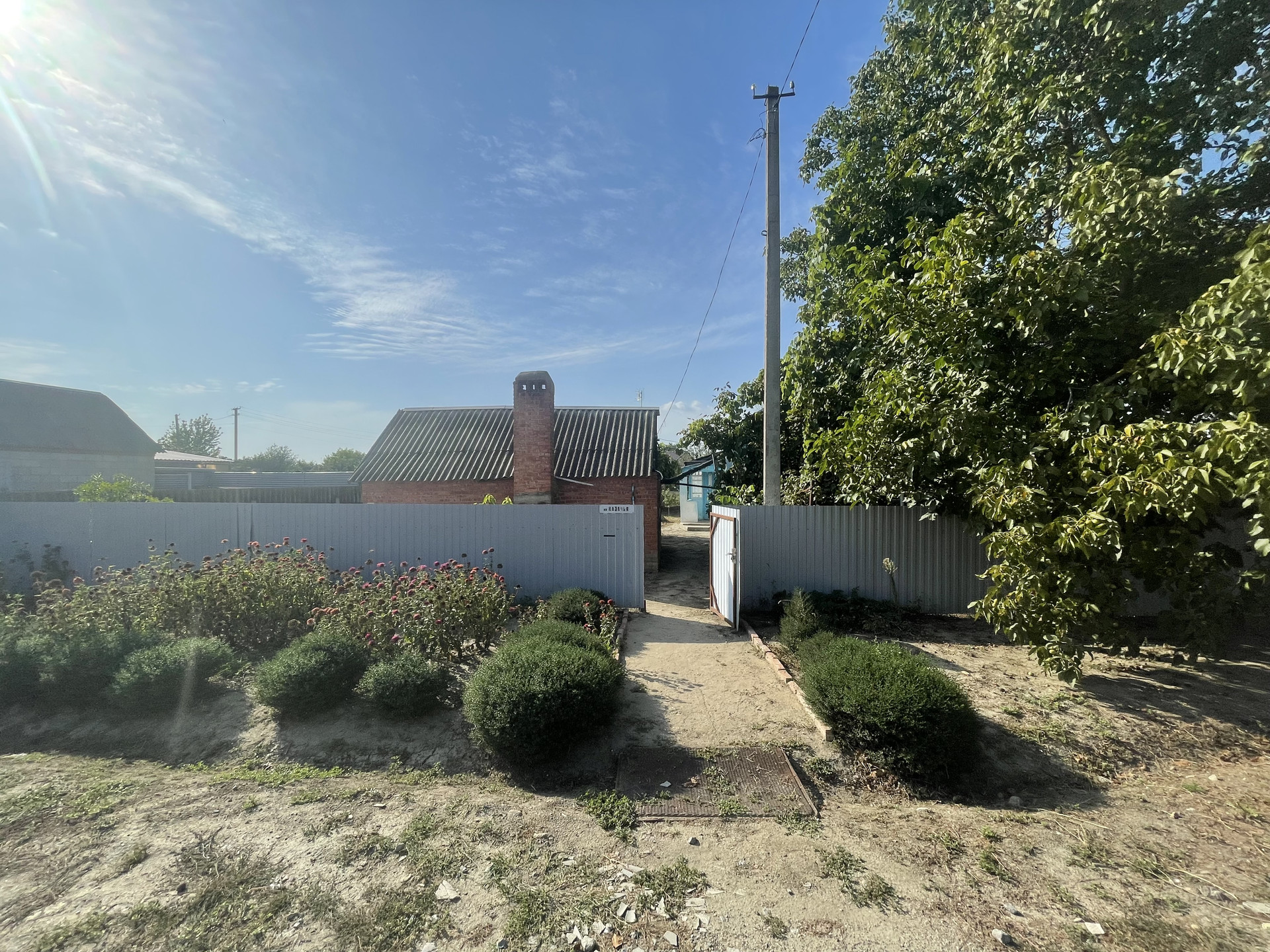 На участке гараж, блочные хоз. постройки, артезианская скважина - 10 м., насосная колонка (металлическая), мощение (железобетонные плиты), растут фруктовые деревья, виноградная беседка, забор металлопрофиль.