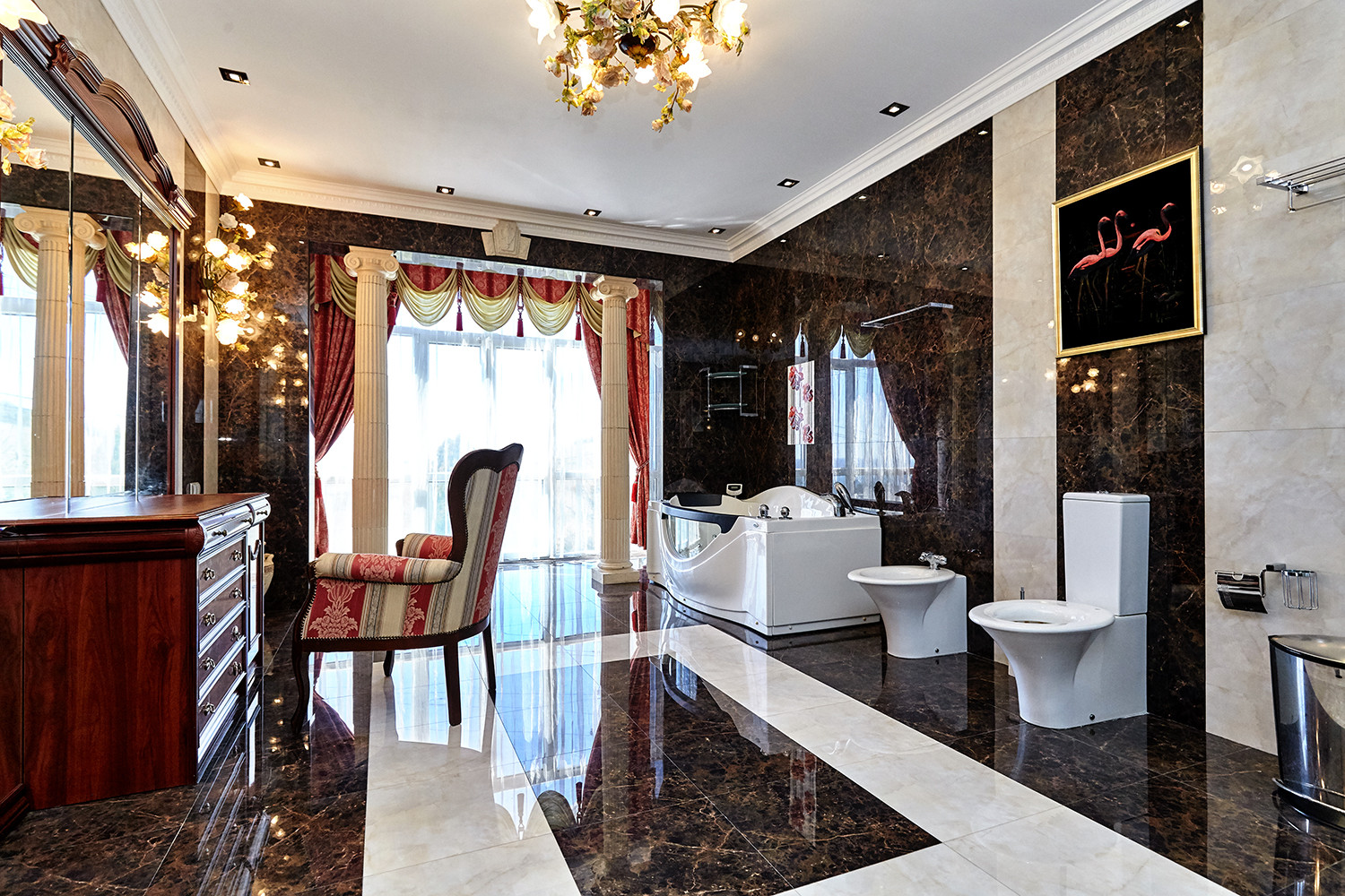 Оформление интерьера решено в стиле американской эклектики с уклоном в византийский стиль.