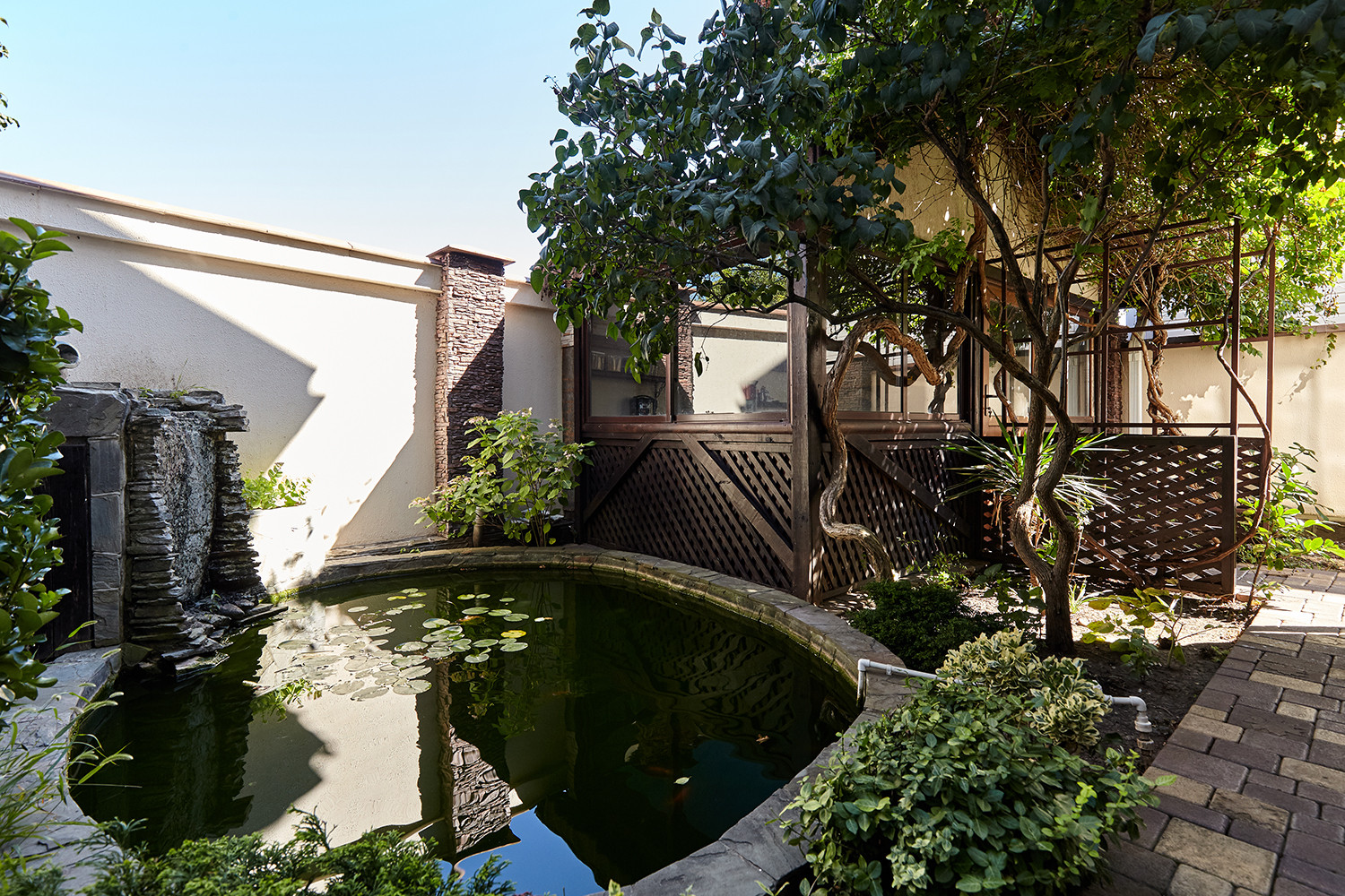 На территории находится подогреваемый бассейн, с максимальной глубиной 2 м, беседка с оборудованной летней кухней, пруд с водопадом, декоративными растениями и рыбками. Зелёные насаждения представлены субтропическими растениями, такими как гранат, инжир, хурма, магнолия и другие.