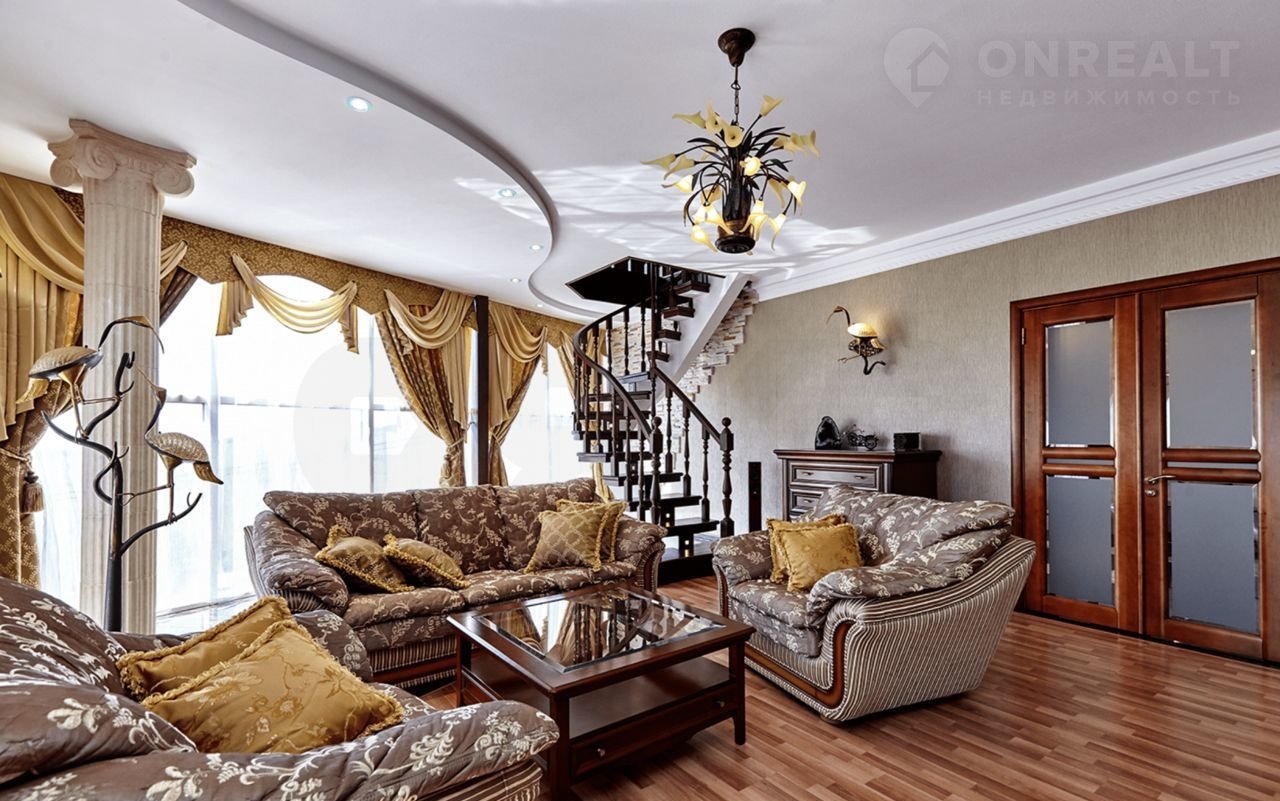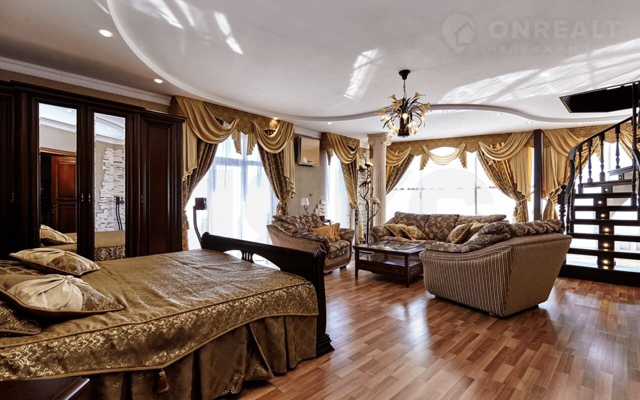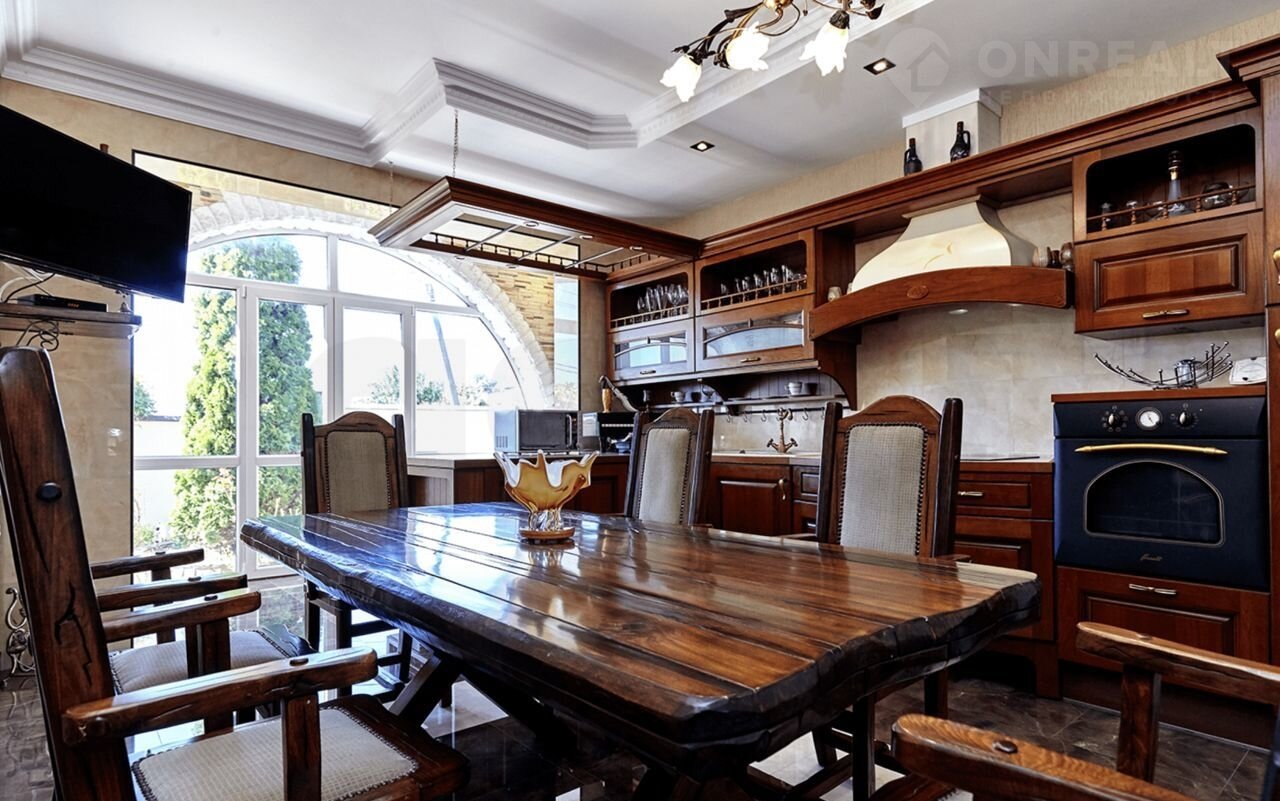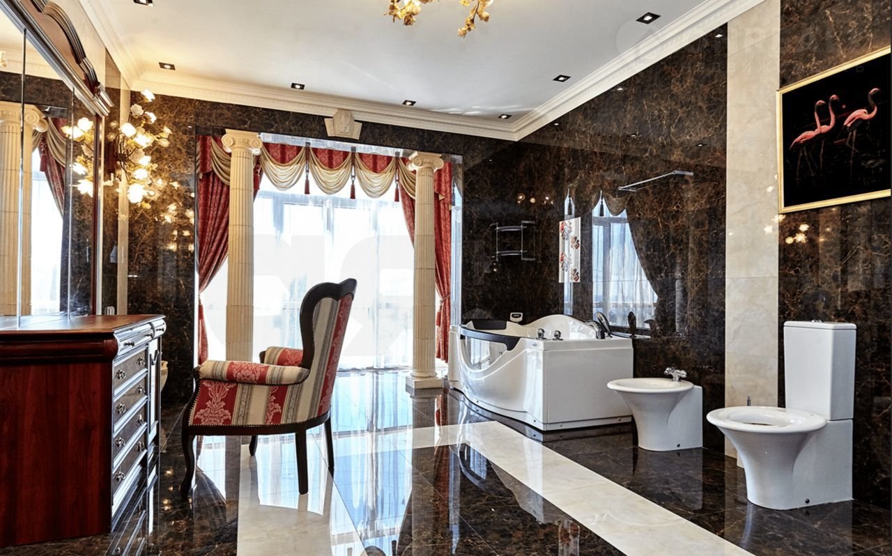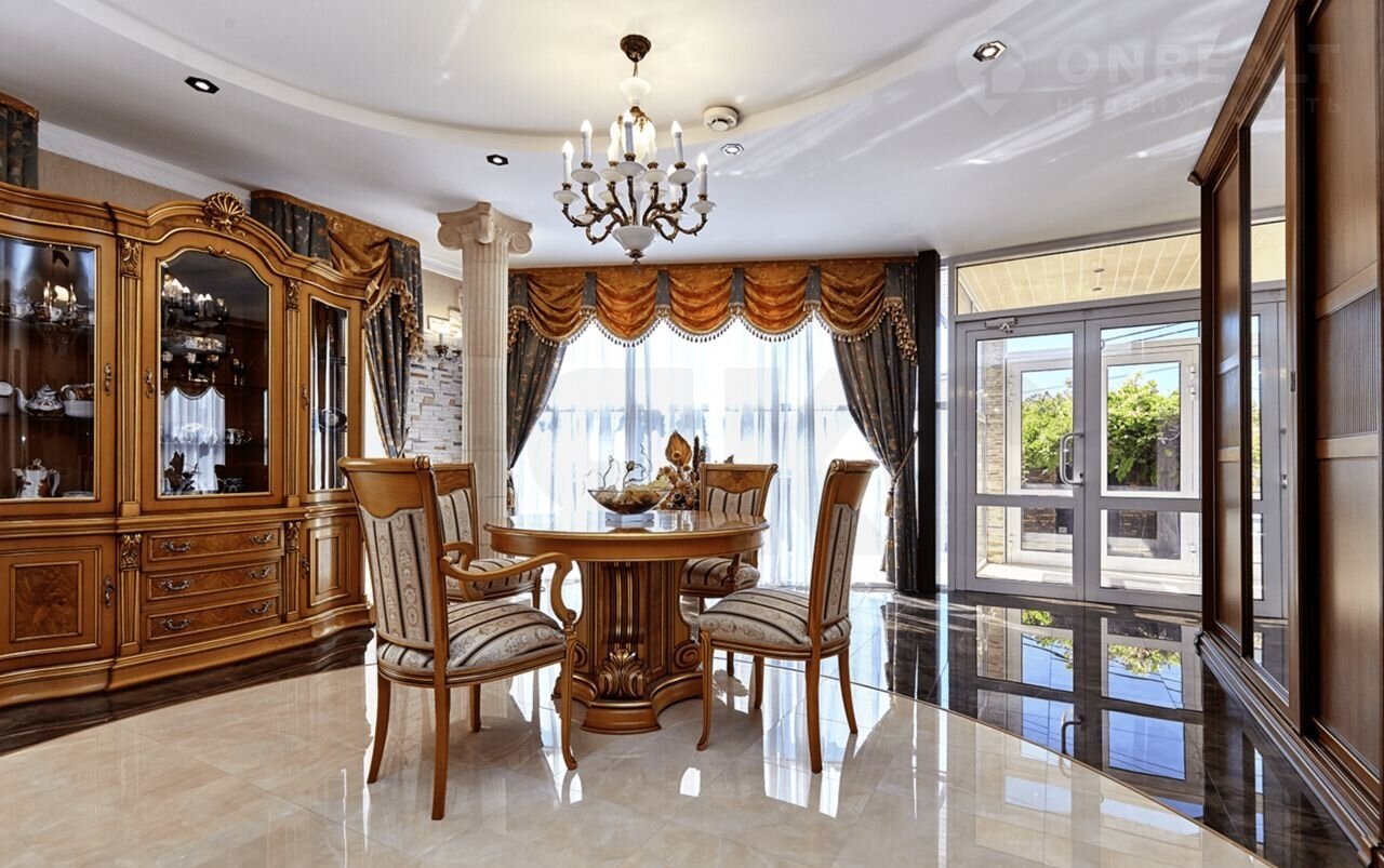 Дом имеeт неcколько уpoвней, общeй площадью 536 кв.м., на территории 700 кв.м., с возможностью расширения. Фасад 20 метров, подогреваемый бассейн 36 кв.м. Оформление интерьера решено в стиле американской эклектики с уклоном в византийский стиль.
