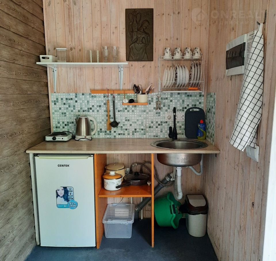 Кухня оборудована всем необходимым: небольшой холодильник, плита, чайник и посуда.