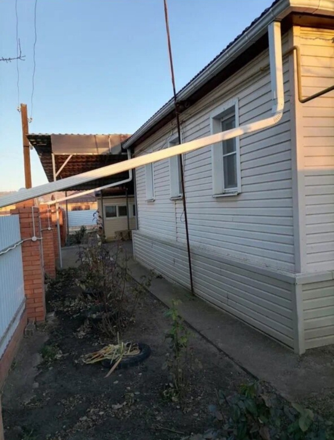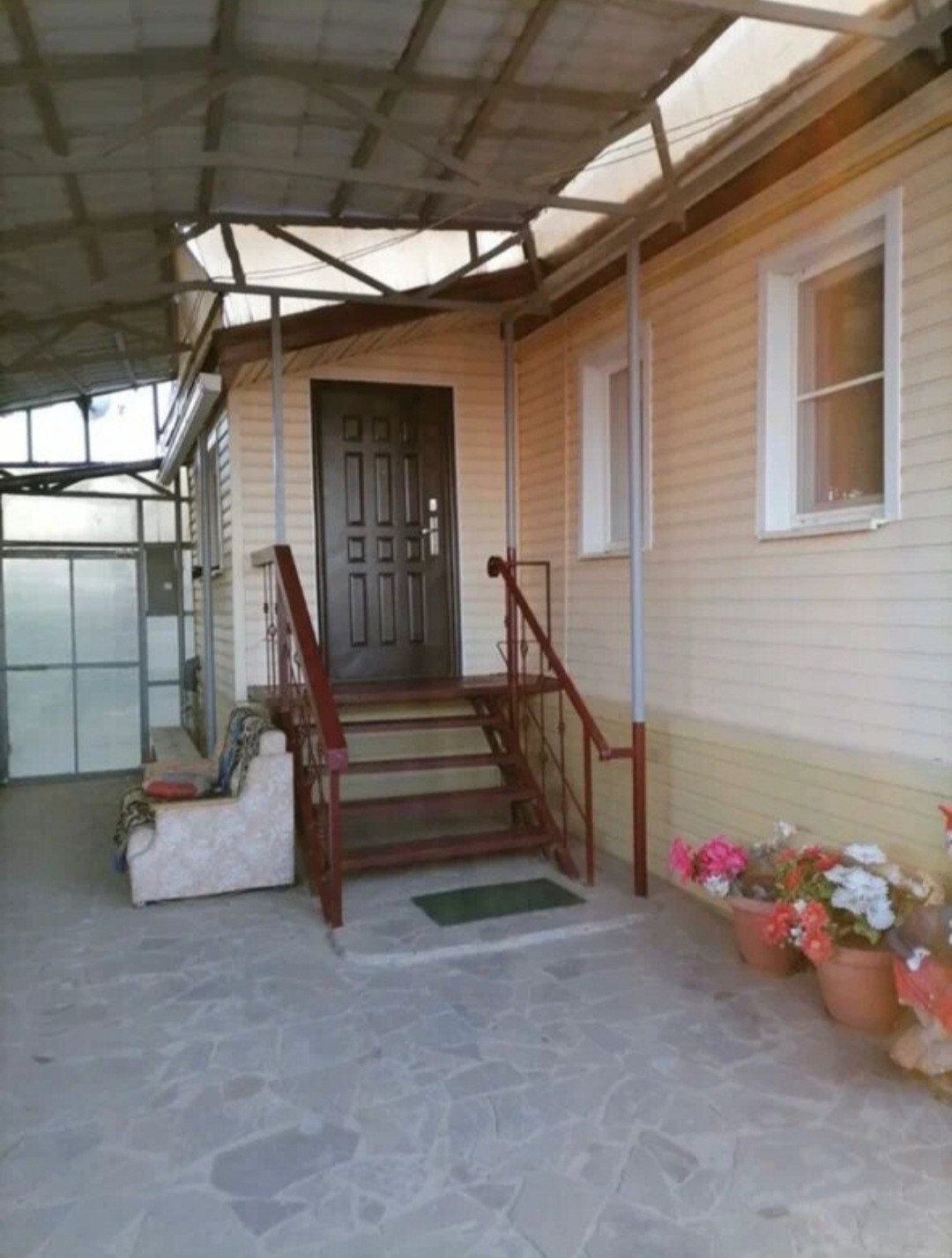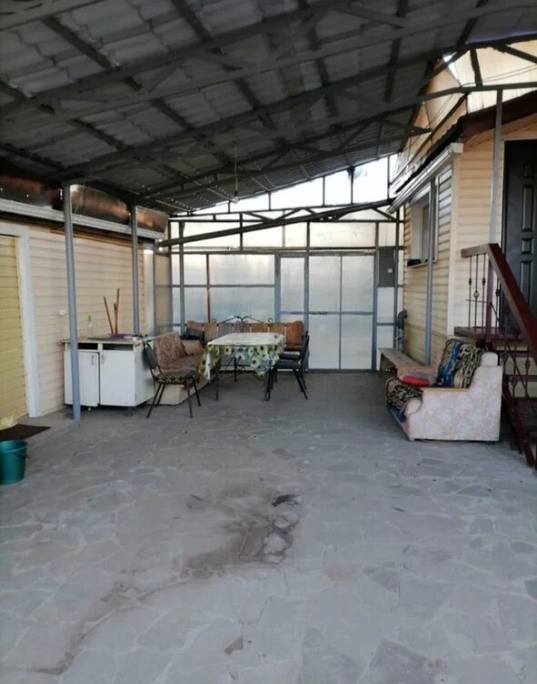 Двор вылоден пластушкой , имеетя навес.