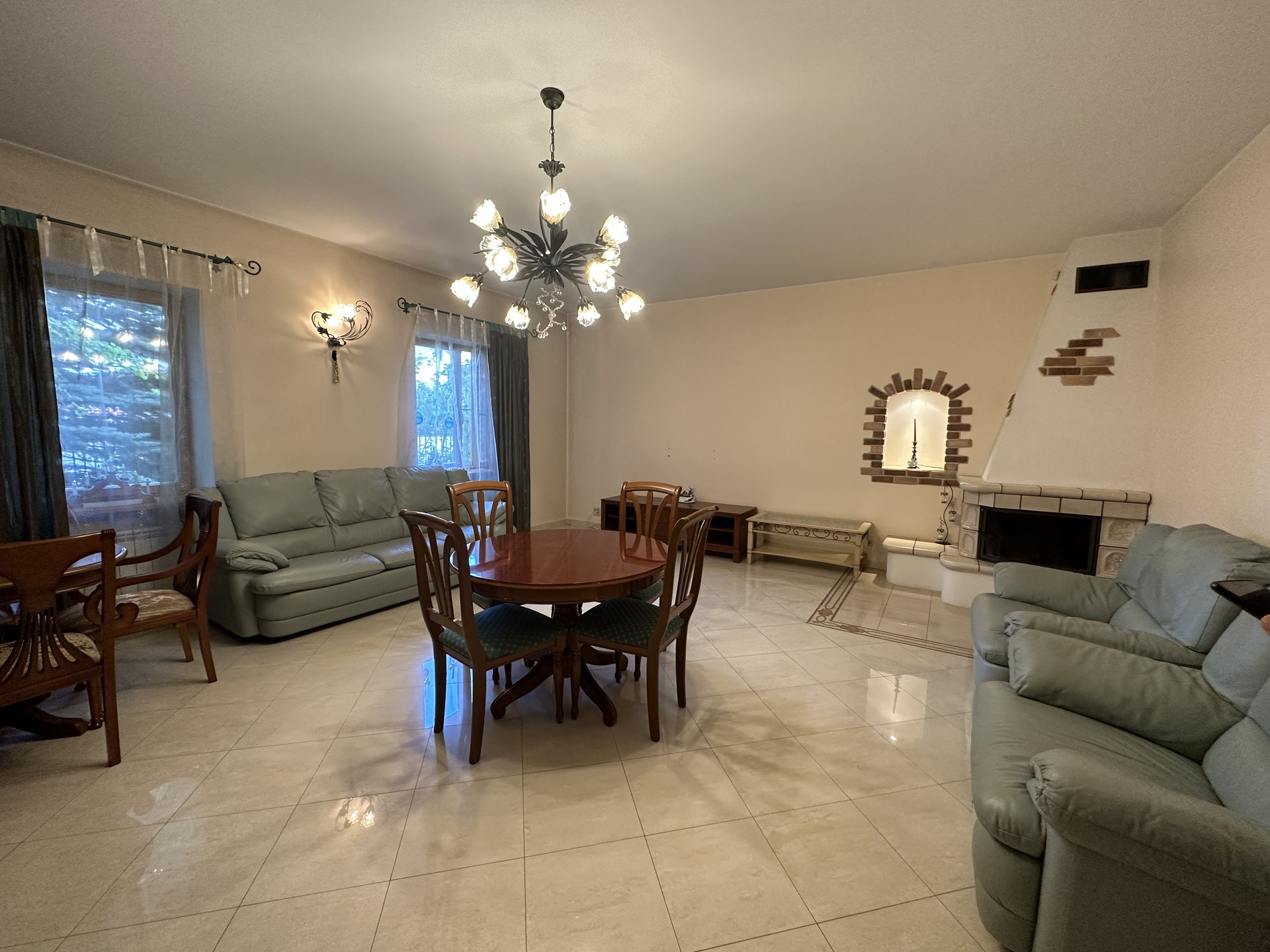 1 этаж : гостиная с камином, кухня-столовая, с/у, постирочная, хоз.комнаты для хранения, вход в гараж.