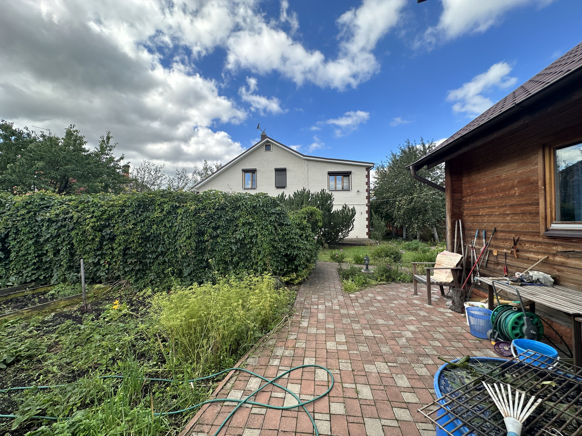 Во дворе гараж , баня с гостевым домом , теплицы, подовые деревья, цветы.