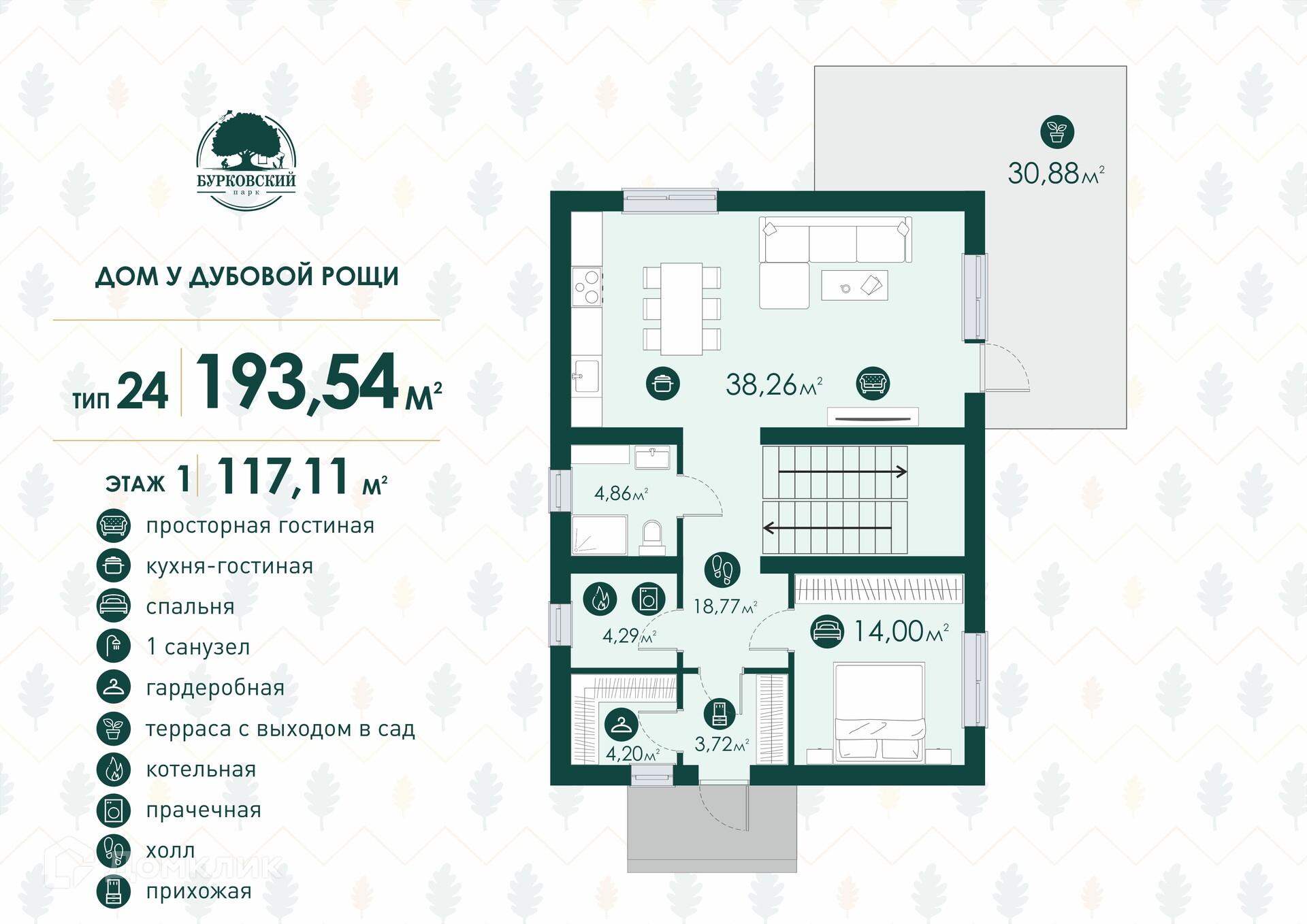 Первый этаж вместе с просторной террасой занимает 117,11 м2: здесь расположилась большая кухня-гостиная 38,26 м2, правильной формы спальня 14,00 м2, комфортный санузел 4,86 м2, 4,29 м2 котельная, гардеробная 4,20 м2 и огромный коридор - здесь найдется место и для домашней библиотеки, и для памятных фото, и для дополнительного места хранения в доме.