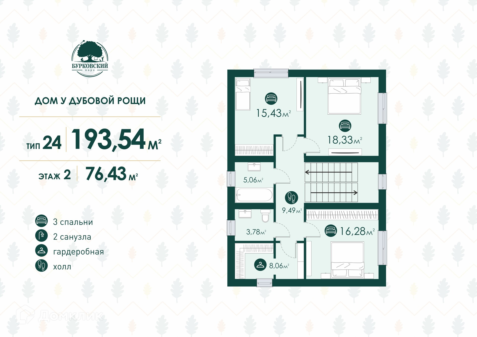 Второй этаж площадью 76,43 м2 вмещает в себя три больших спальни, просторную ванную комнату 5,06 м2, отдельный туалет 3,78 м2. Также здесь наличествуют гардеробные и большой холл - никаких проблем с системой хранения, все вещи на своих местах!