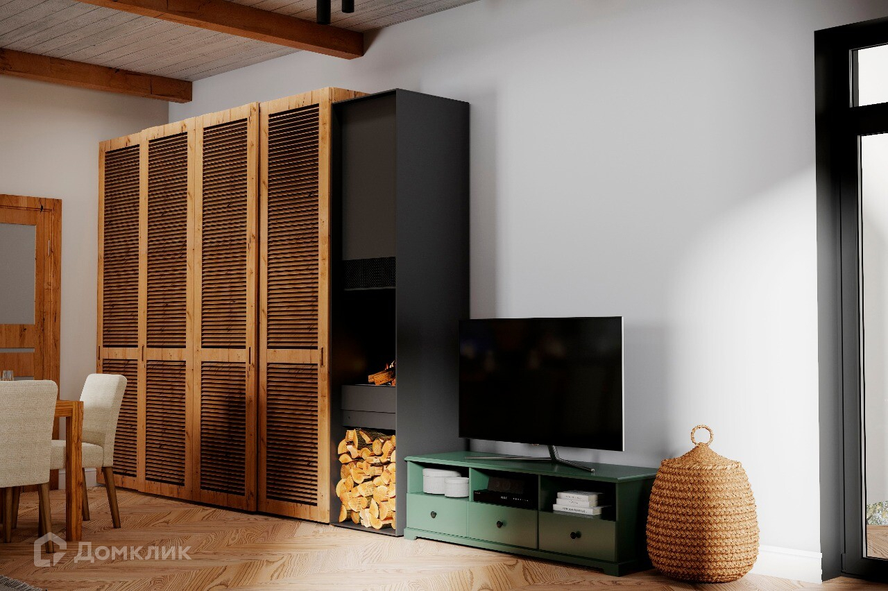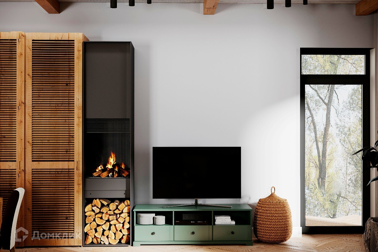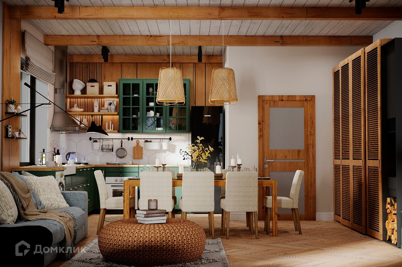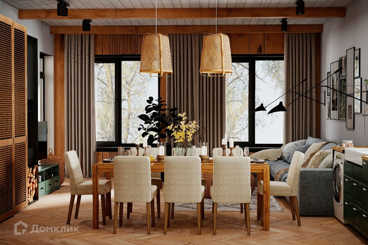 Здесь и камин с тлеющими угольками, у которого можно согреться. И плетеные люстры, которые навевают детские воспоминания о родном бабушкином домике в селе. И большой, мягкий диван с приятными телу пледами - любимые книги будут читаться всласть. Вокруг - теплые тона дерева - природные мотивы во всей красе!
