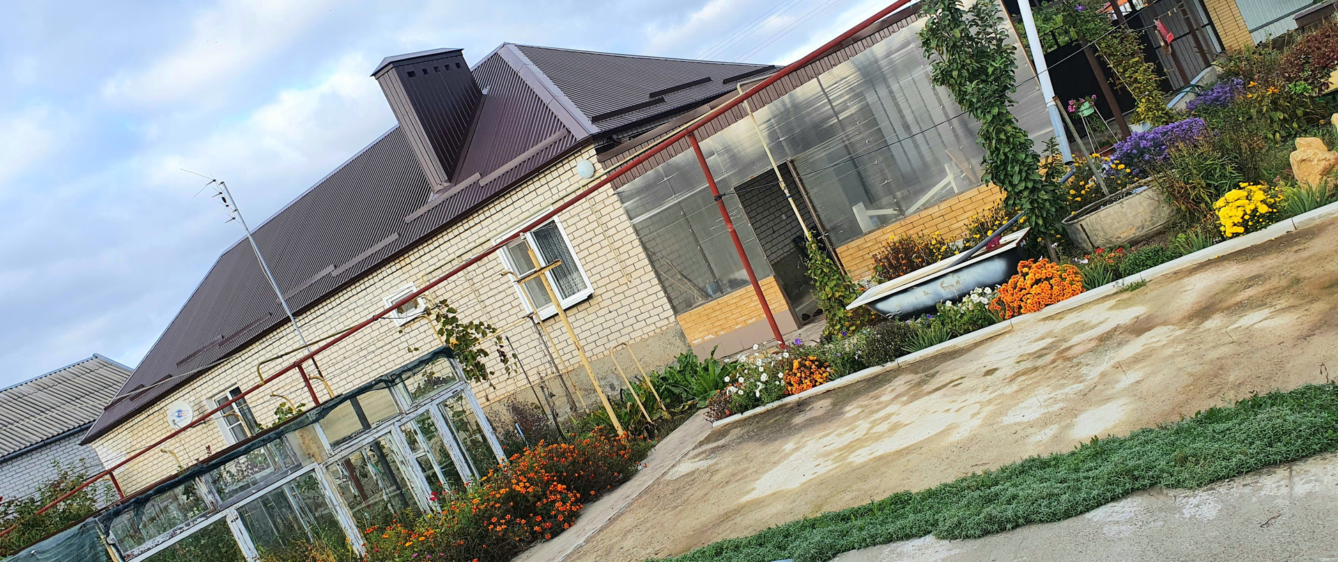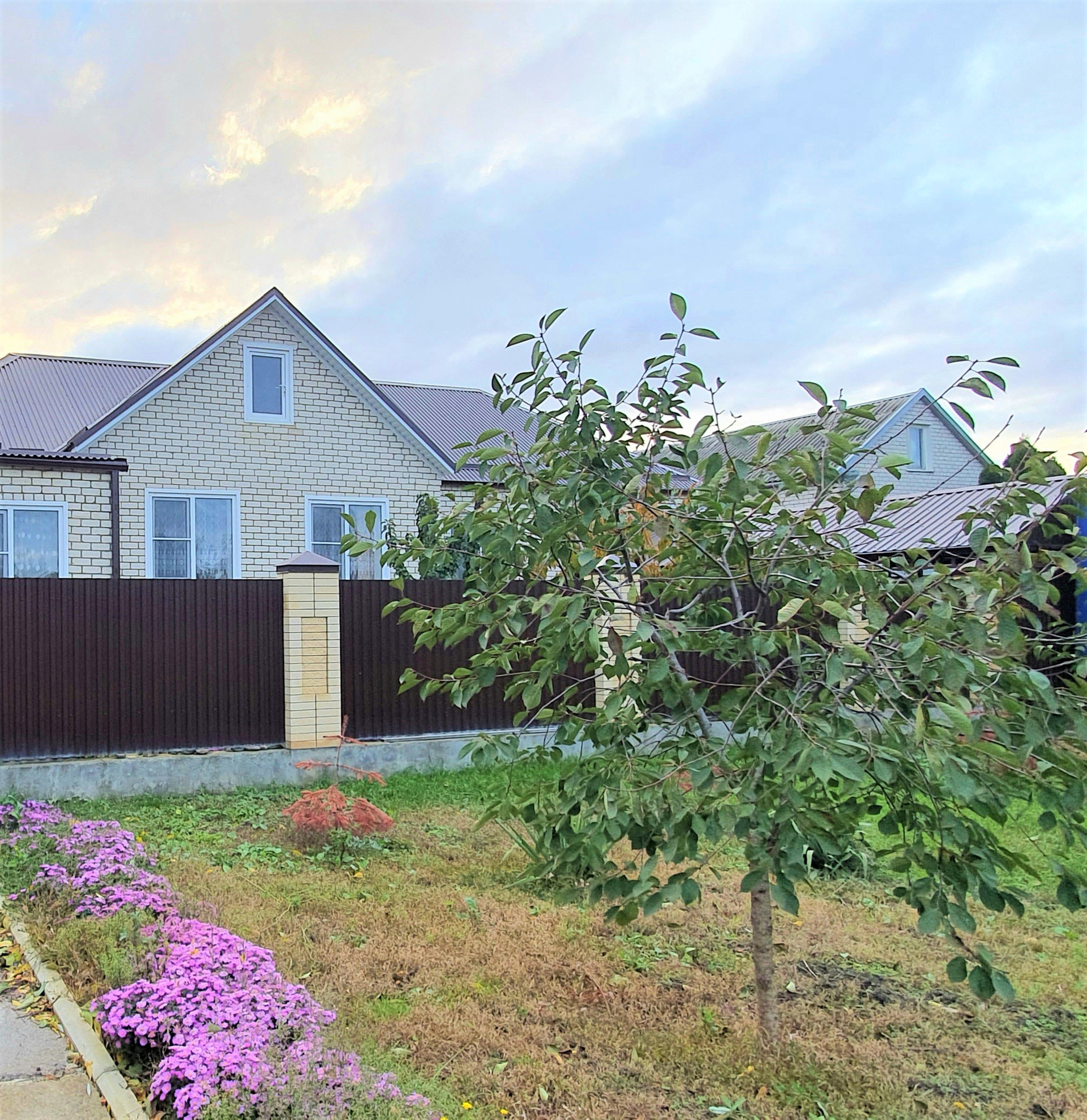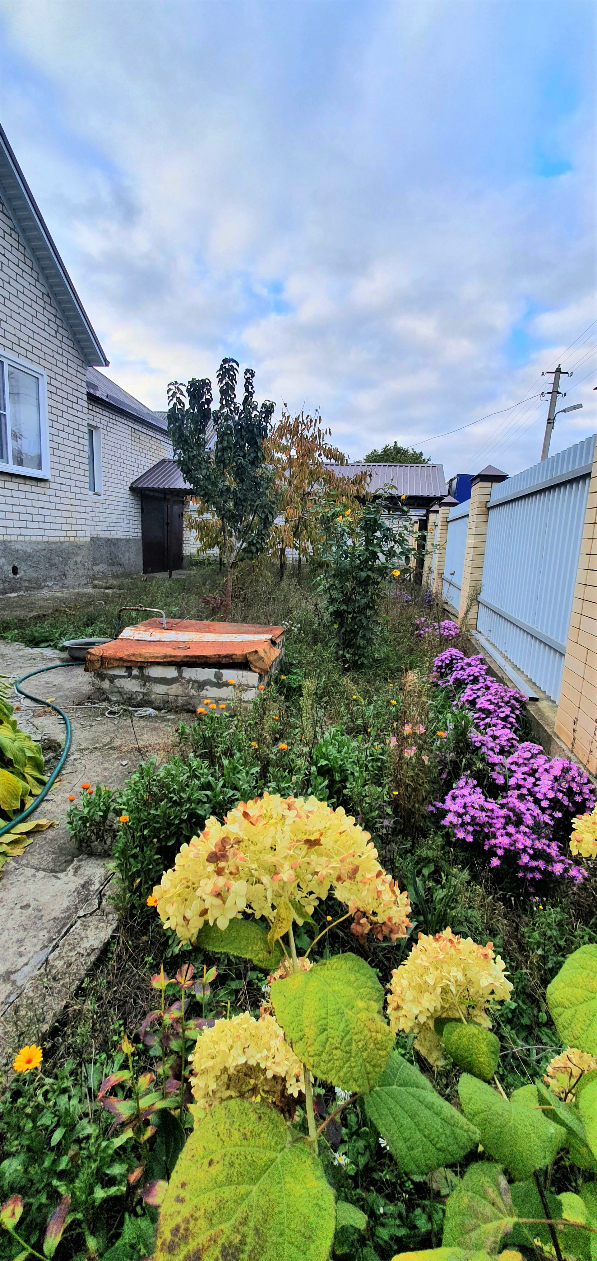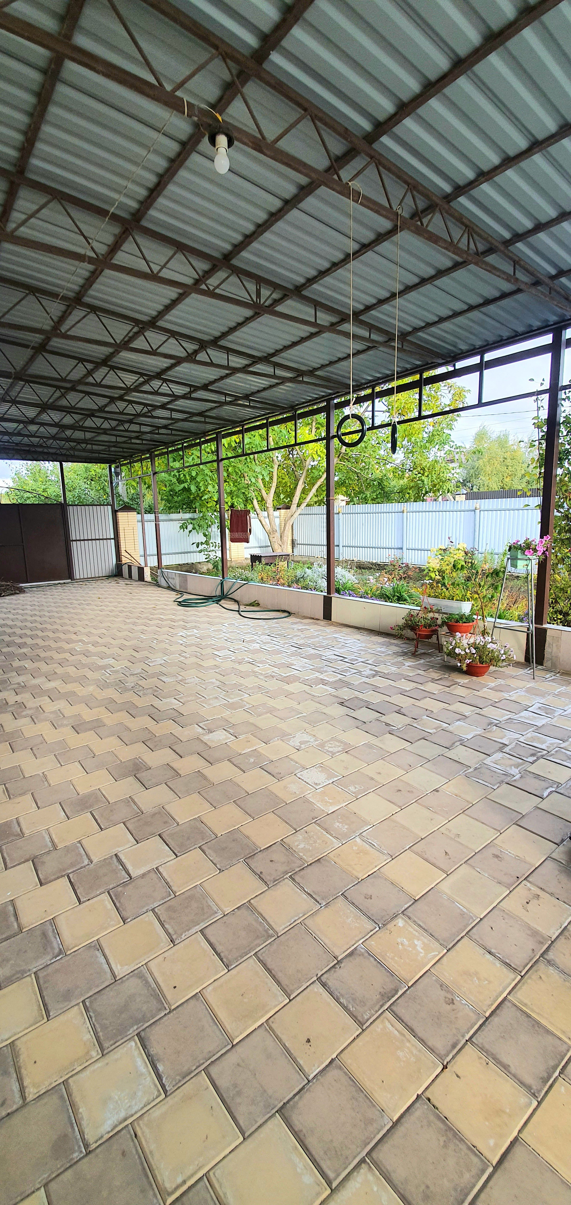 Двор вымощен тротуарной плиткой с крытым навесом. Во дворе построен капитальный хозяйственный блок. Бетонированная площадка под бассейн. Большой фруктовый сад: яблони разных сортов, вишня, ранняя черешня, абрикосы, малина, смородина, крыжовник, виноград, крупный орех.