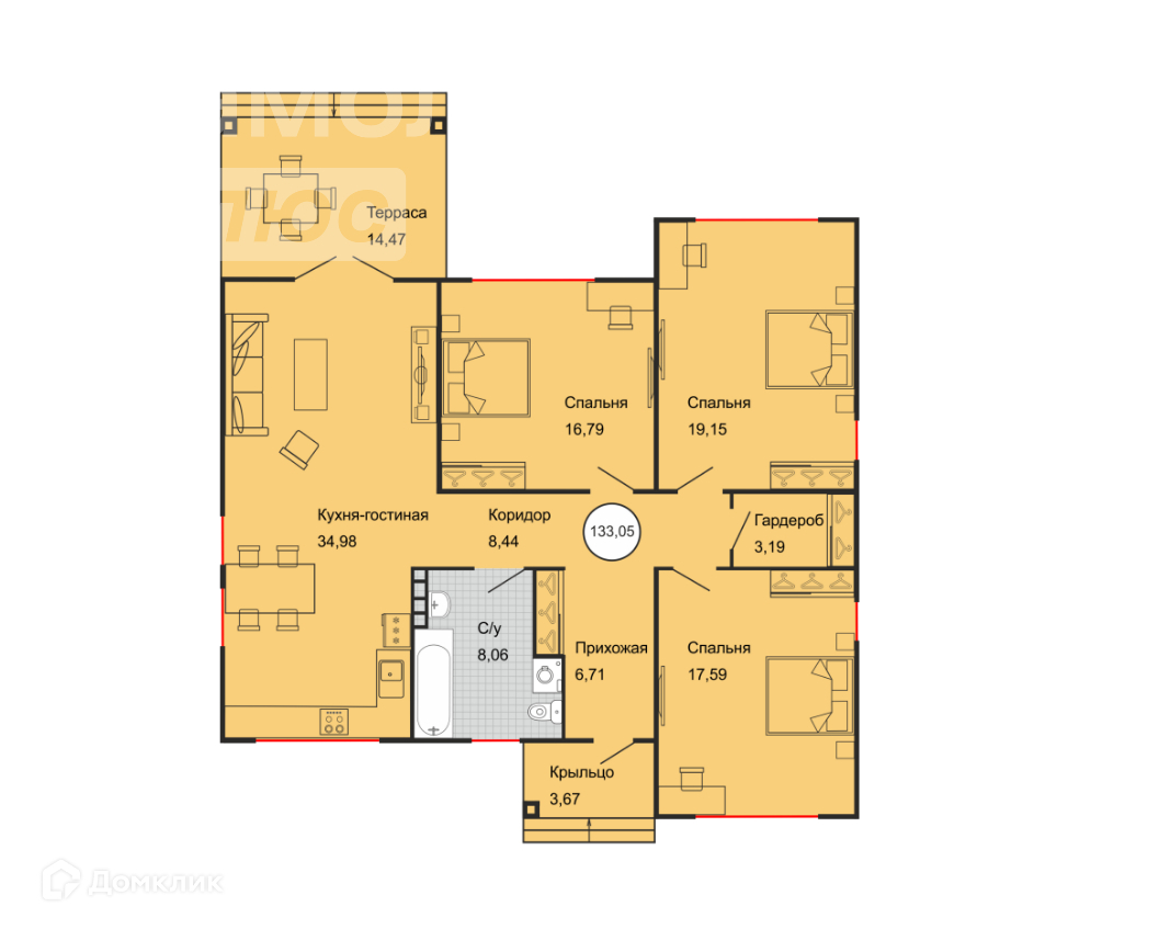 Площадь кухни 34.9 м2