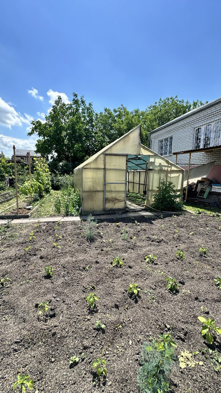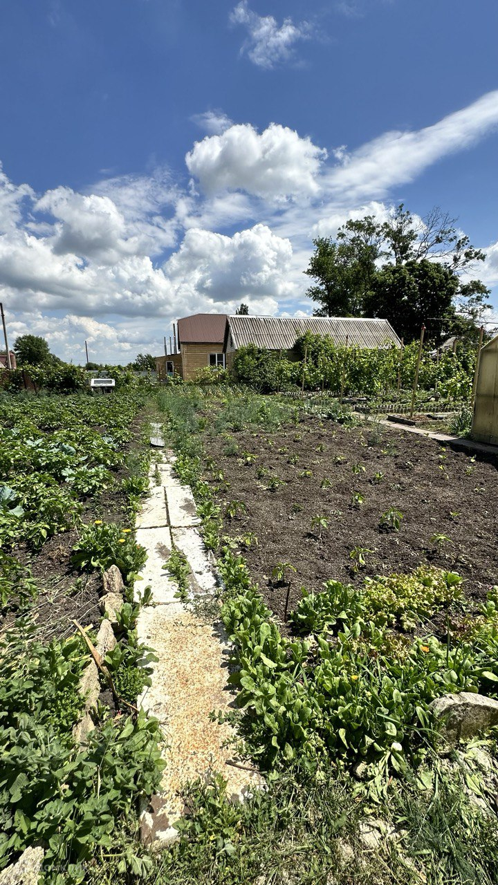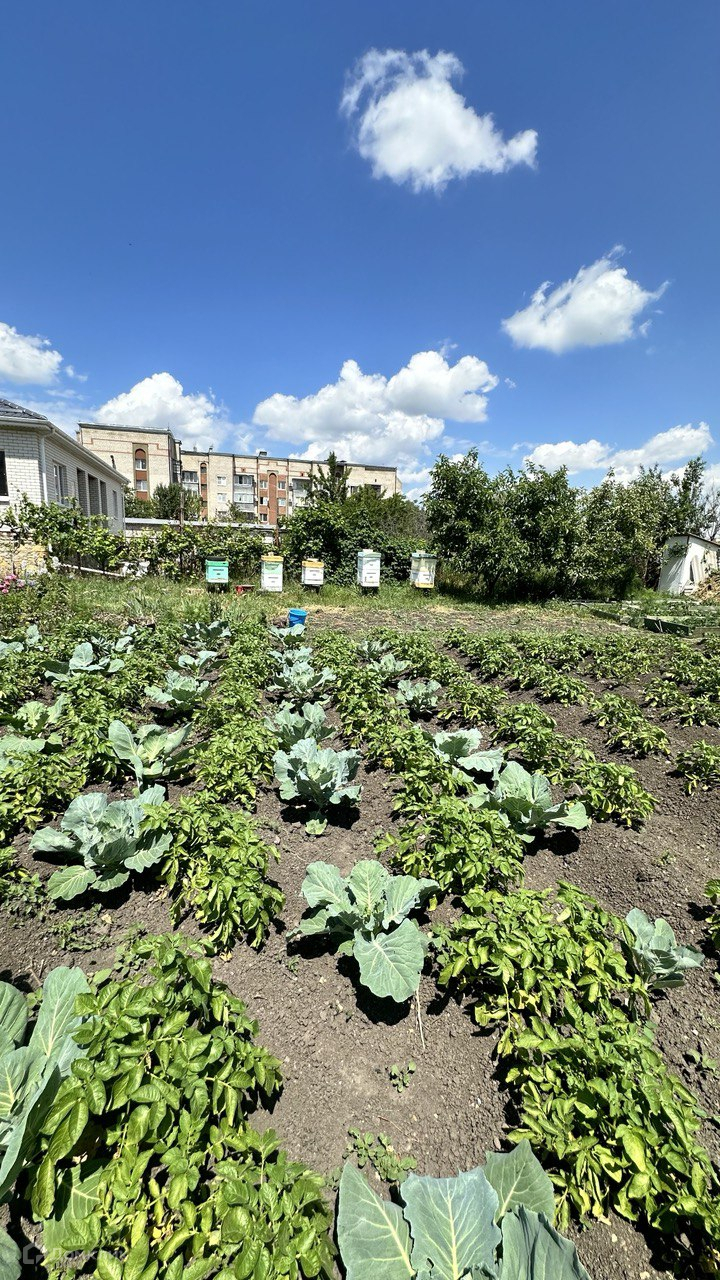 Огород ухоженный, растут плодовые деревья.