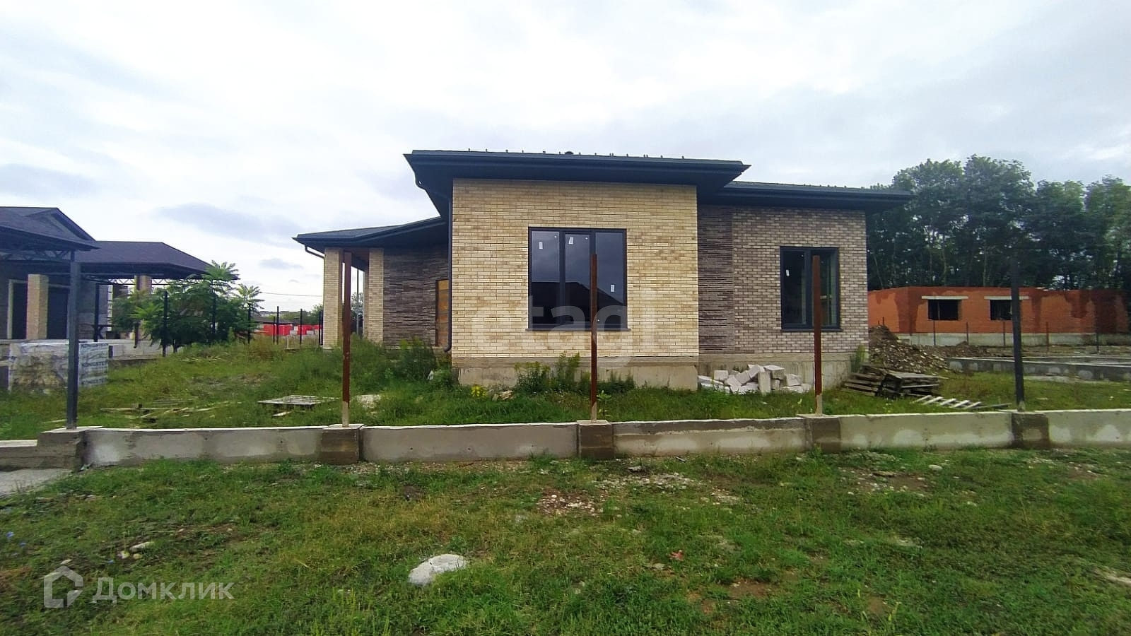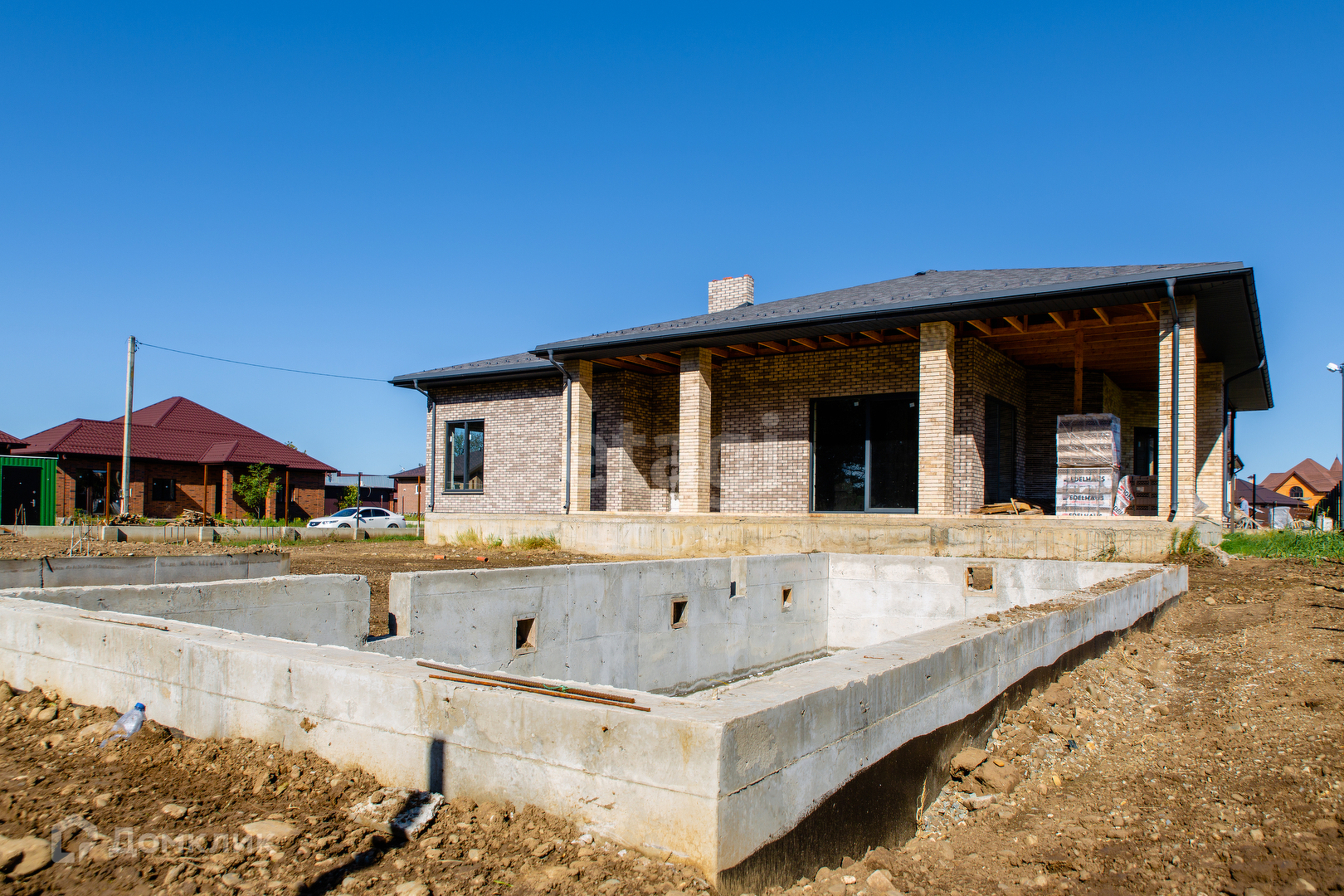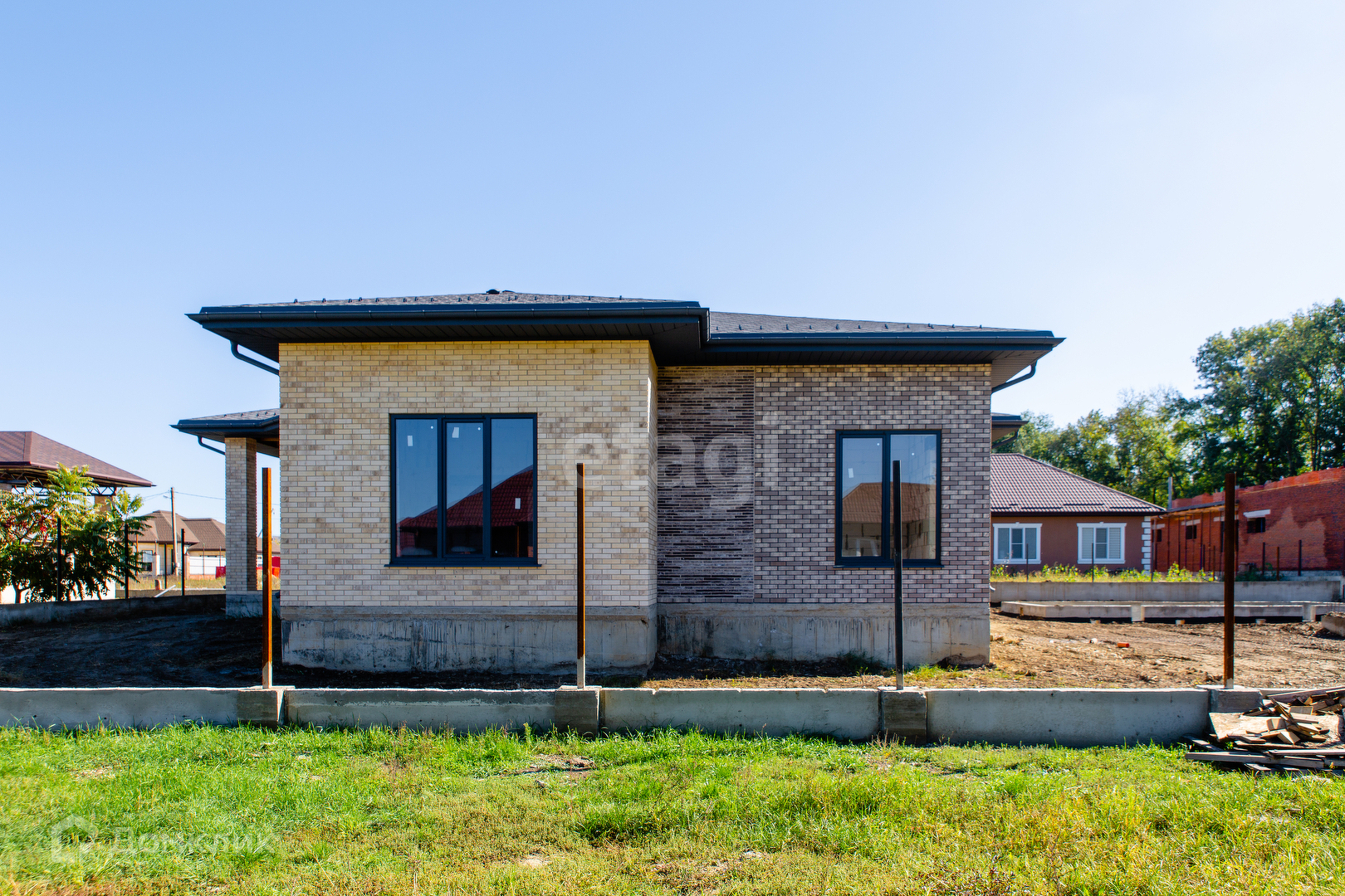 Дом расположен на участке 12 соток. Фасад 18м. х 20м. Одноэтажный, площадь - 190 кв.м. На участке залита чаша под бассейн - 11 м. х 5 м., так-же залит фундамент под лаунж-зону 11м. х 7,5м. или можно использовать под гостевой дом.