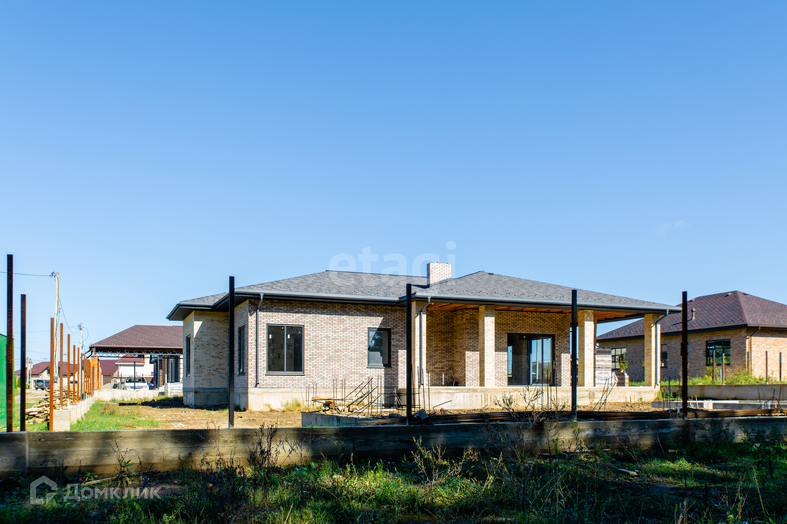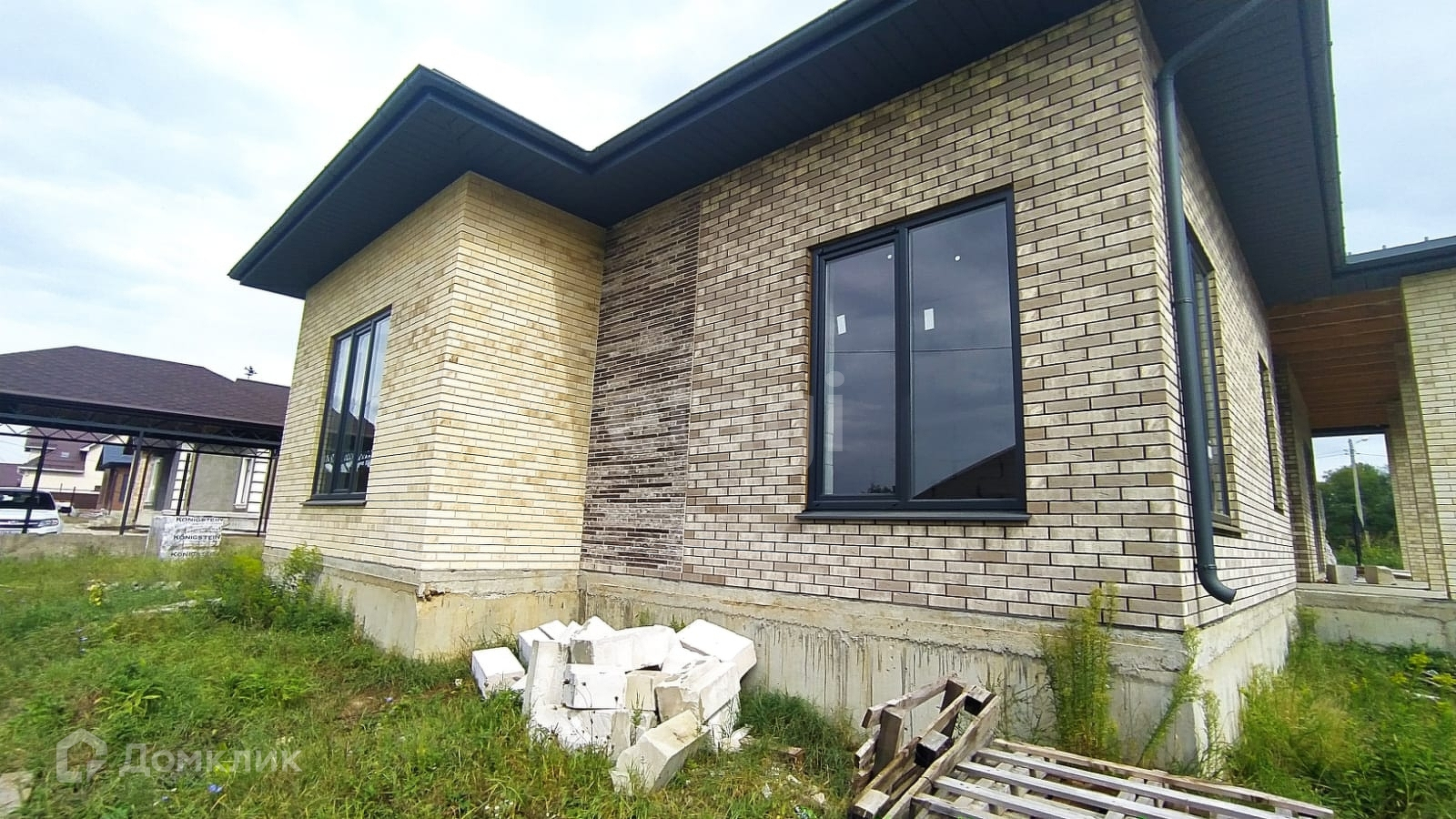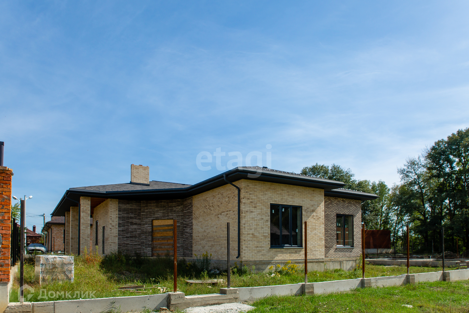 Дом расположен на участке 12 соток. Фасад 18м. х 20м. Одноэтажный, площадь - 190 кв.м. На участке залита чаша под бассейн - 11 м. х 5 м., так-же залит фундамент под лаунж-зону 11м. х 7,5м. или можно использовать под гостевой дом.