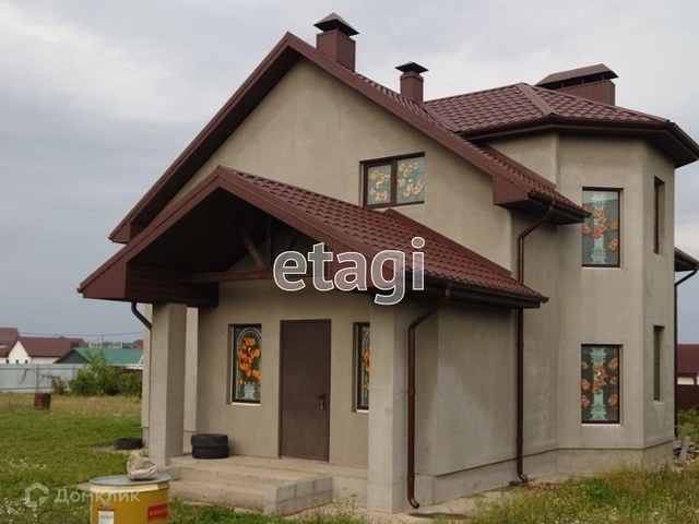 Дом построен из блоков Аэробел толщиной 400 мм. Дополнительно выполнено утепление фасада толщиной 50 мм. Фасад дома подготовлен для нанесения декоративных покрытий. Перекрытия между этажами устроены из бетонных плит заводского производства. Крыша выполнена из металлочерепицы Grand Line, утепление крыши 200 мм.