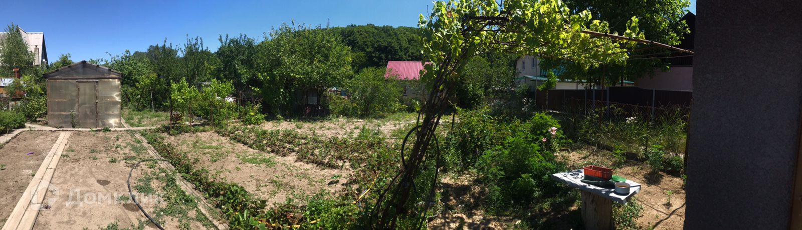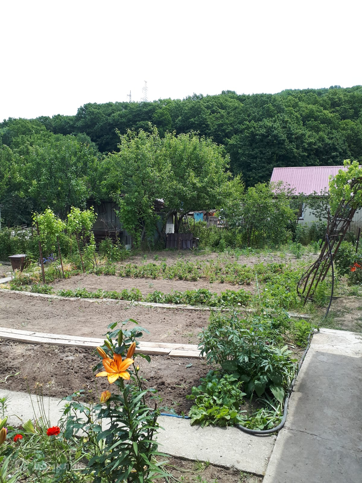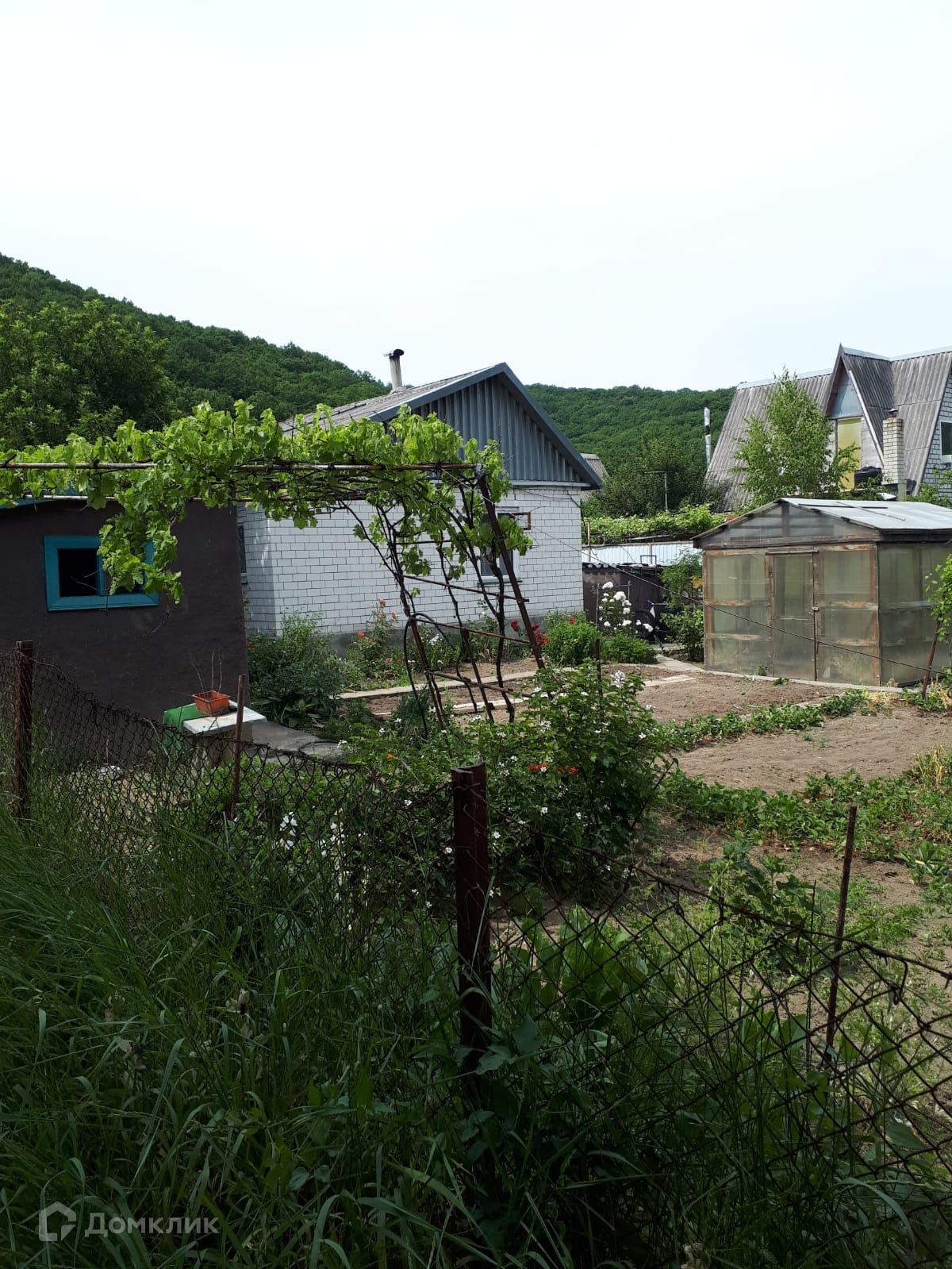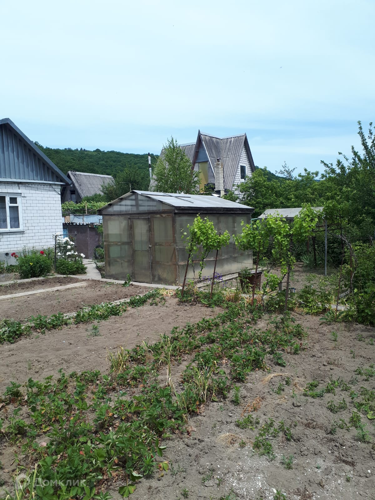 Участок 5,4 сотки. На участке есть плодовые деревья и кустарники: яблони, сливы, малина, крыжовник, черная и красная смородина, виноград черный и зеленый, клубника, 1 большая теплица. А также баня и душ, также есть хозпостройки, летняя кухня.