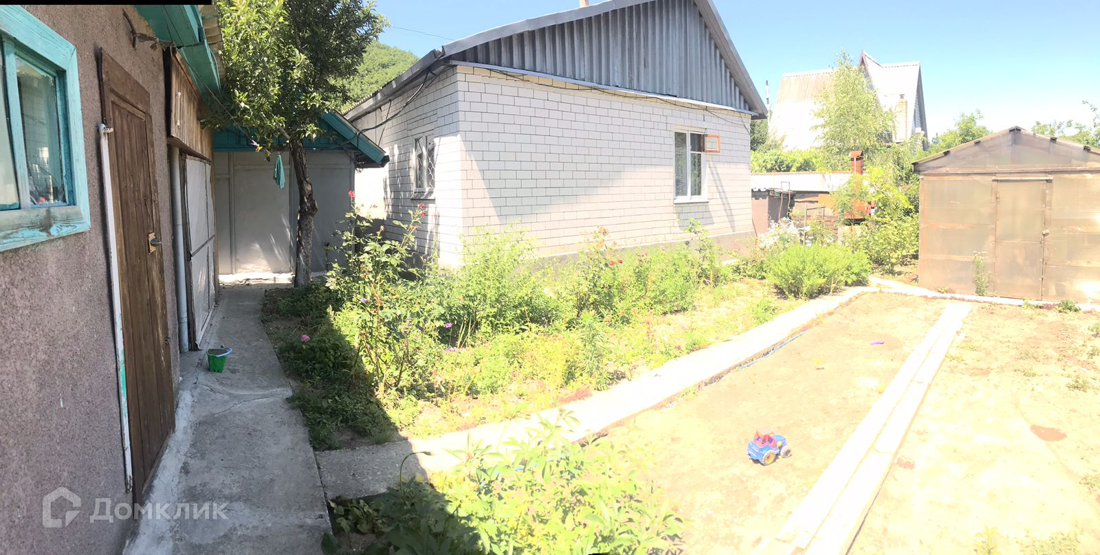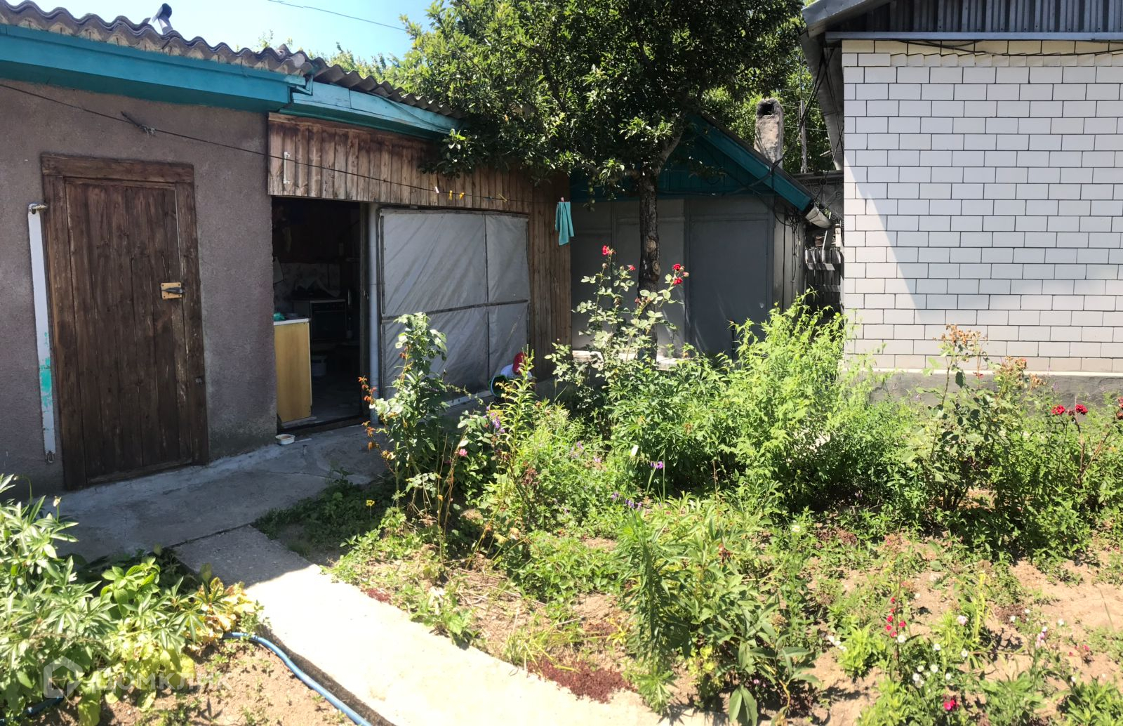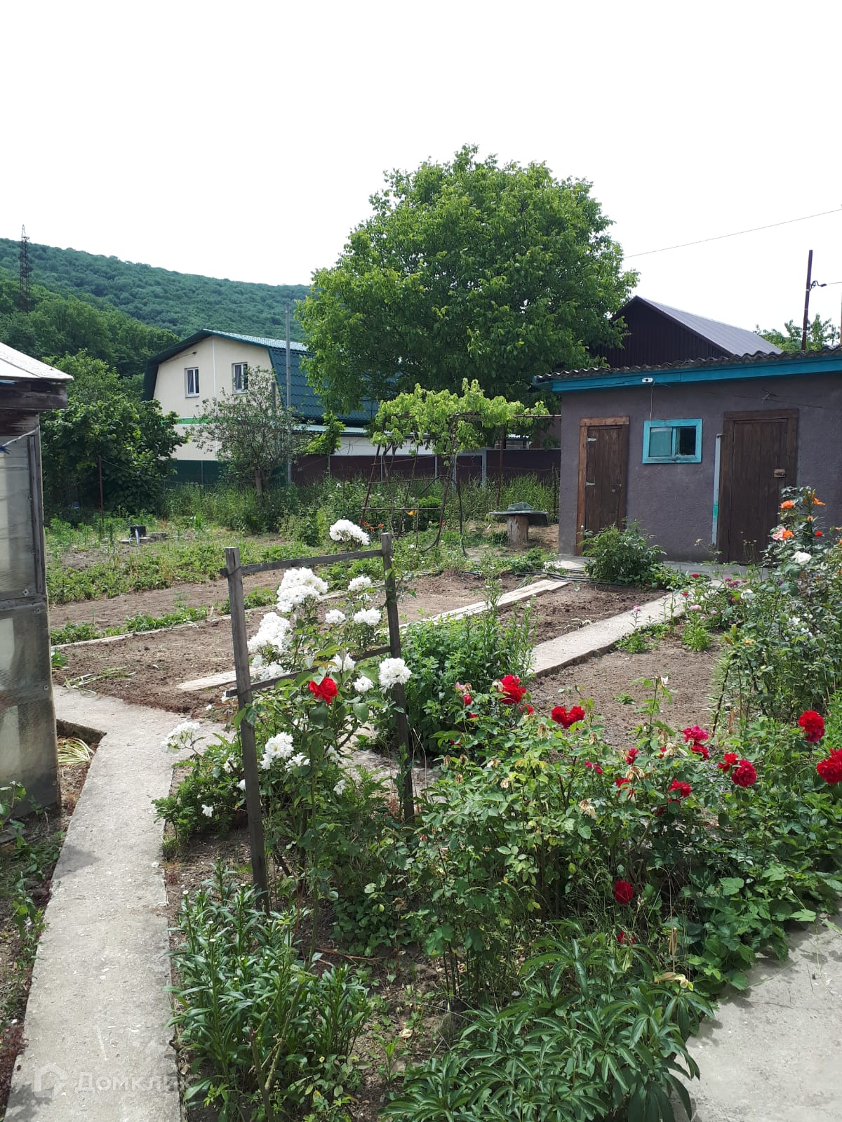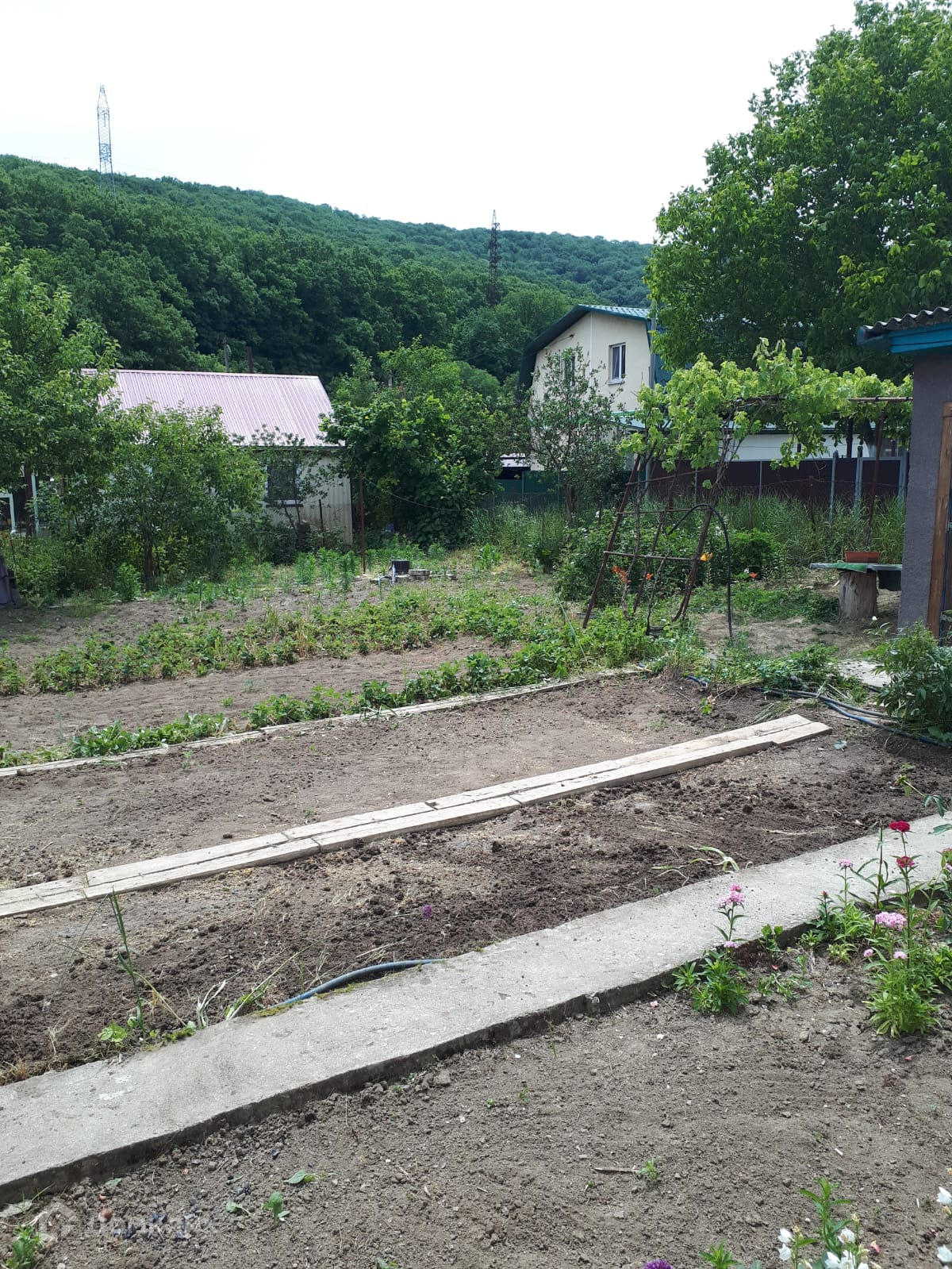 Участок 5,4 сотки. На участке есть плодовые деревья и кустарники: яблони, сливы, малина, крыжовник, черная и красная смородина, виноград черный и зеленый, клубника, 1 большая теплица. А также баня и душ, также есть хозпостройки, летняя кухня.