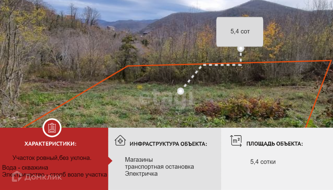 Продается участок 5,4 сотки в живописном месте в п.Горный (С/Т Горный орех). В шаговой доступности лес и небольшая речка. Участок находится на возвышенности,что исключает возможность подтопления. Ровный, без уклона, правильной формы. Федеральная автодорога Е115 Новороссийск-Краснодар обеспечивает удобность развязки.Продуктовые магазины в 2-х минутах езды на машине. Рядом остановка маршрутного транспорта, так же недалеко стабильно ходит электричка до города.Один хозяин. Без обременения и ограничений. Звоните!
