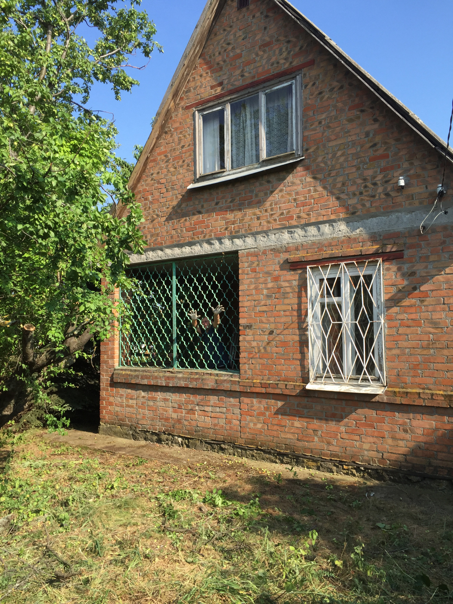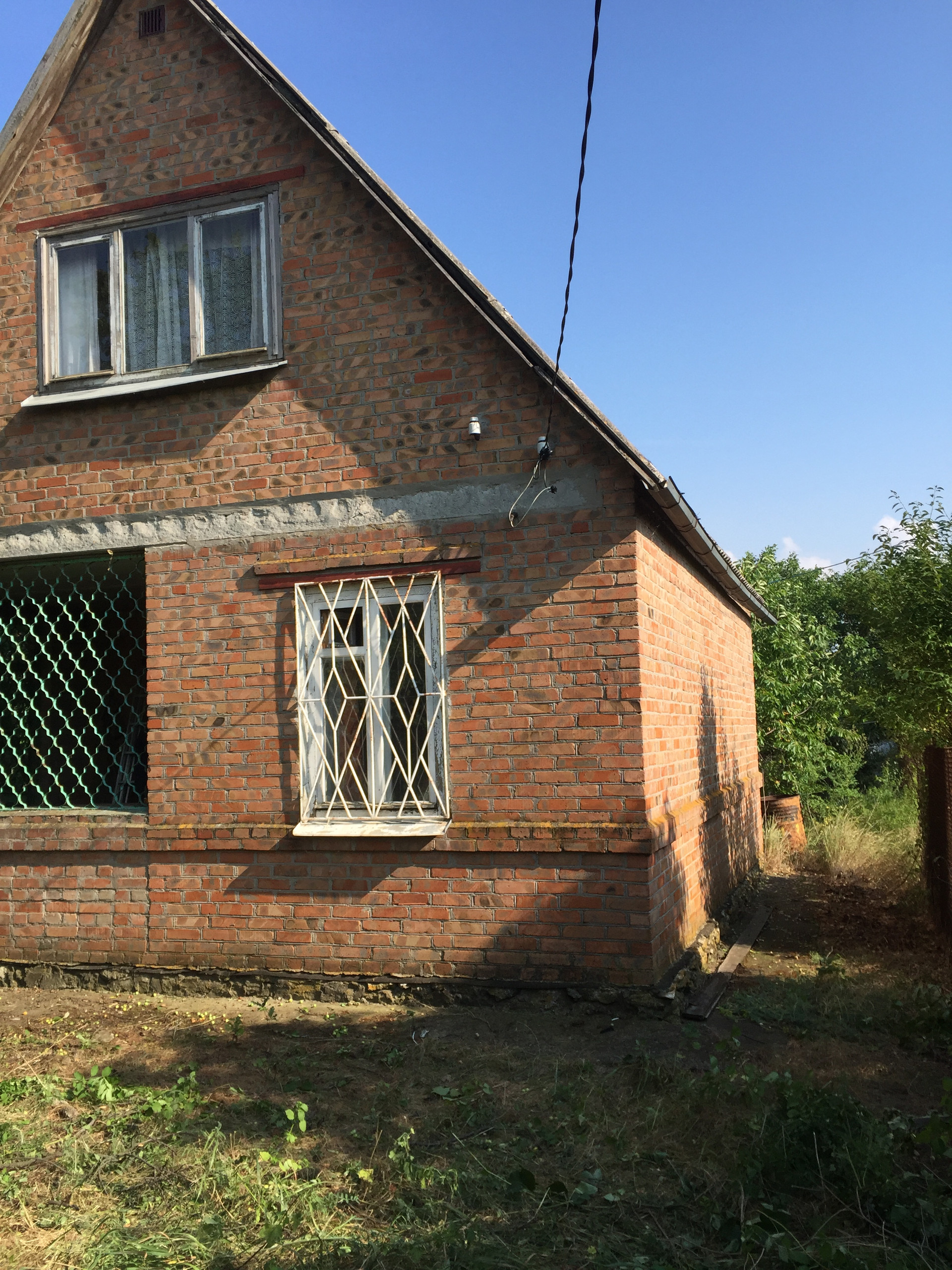 Кирпичный дом, крыша покрыта шифером, окна деревянные с решетками. Дом аккуратный, добротный, имеет: на 1 этаже веранда, комната для отдыха с диваном, мебелью и телевизором, кухня (холодильник, электрическая печь, посуда), на втором этаже комната-мансарда и выход на большой балкон, перекрытие 2 этажа железобетоные плиты.
