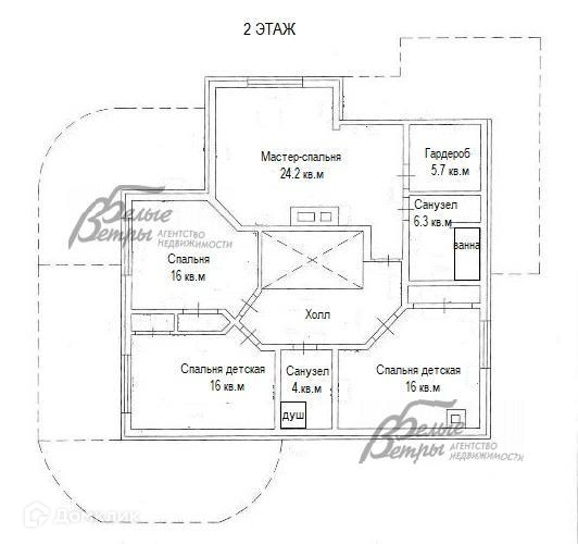 2-ой этаж: мастер-спальня 24 кв.м с санузлом 6 кв.м с ванной, гардеробная 6 кв.м, спальня 16 кв.м, спальня детская 16 кв.м, спальня гостевая 16 кв.м, санузел 4 кв.м с душем..