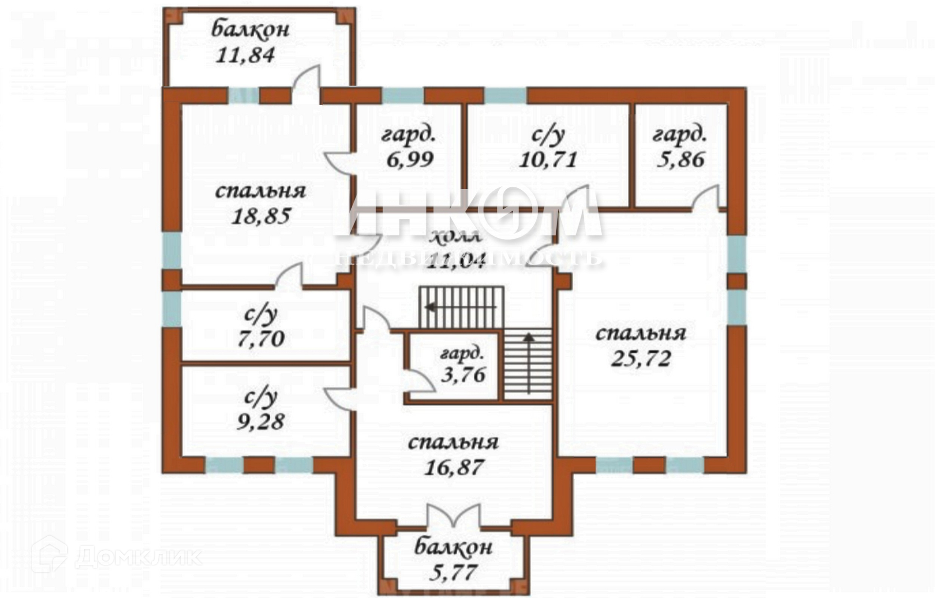 На втором этаже: холл, 4 спальни, 3 гардеробные, 3 с/у, балкон