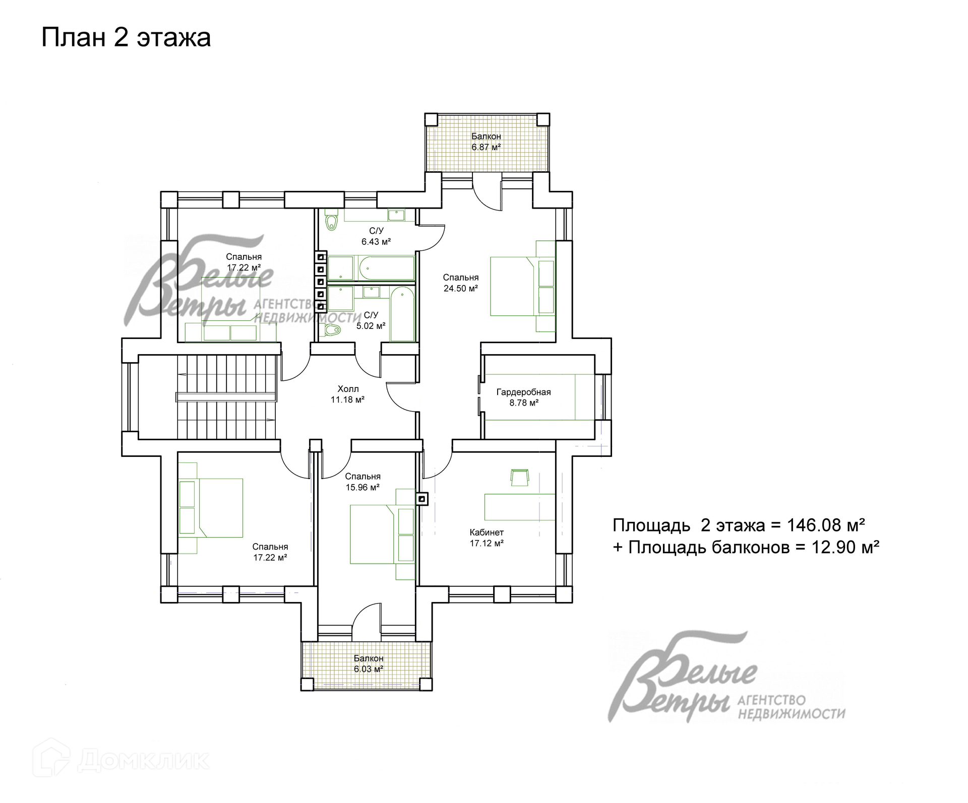 2-ой этаж: холл 11 кв.м, Главная спальня 24.5 кв.м с гардеробной 9 кв.м, с санузлом 6.4 кв.м и выходом на балкон 7 кв.м; спальня 17 кв.м, спальня/кабинет 17 кв.м, спальня 16 кв.м с выходом на балкон 6 кв.м, спальня 17 кв.м, санузел 5 кв.м.