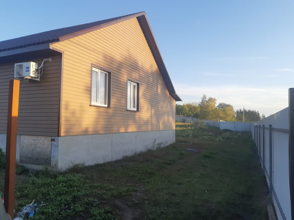 Дом 126 кв.м. (9х9 метра) из бруса 150 обшит сайдингом, СПЛИТ система по всему дому, фундамент – металлические сваи.