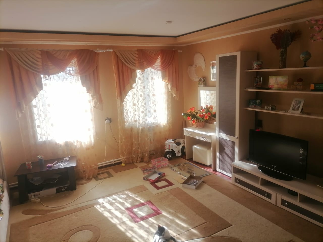 Общая площадь 65 кв.метров.  2-комн., все удобства, электричество в доме, вода в доме, канализация яма, отопление котел, газ в доме, санузел в доме, состояние хорошее, подъездные пути асфальт, въезд, двор свой, 5.6 сот.