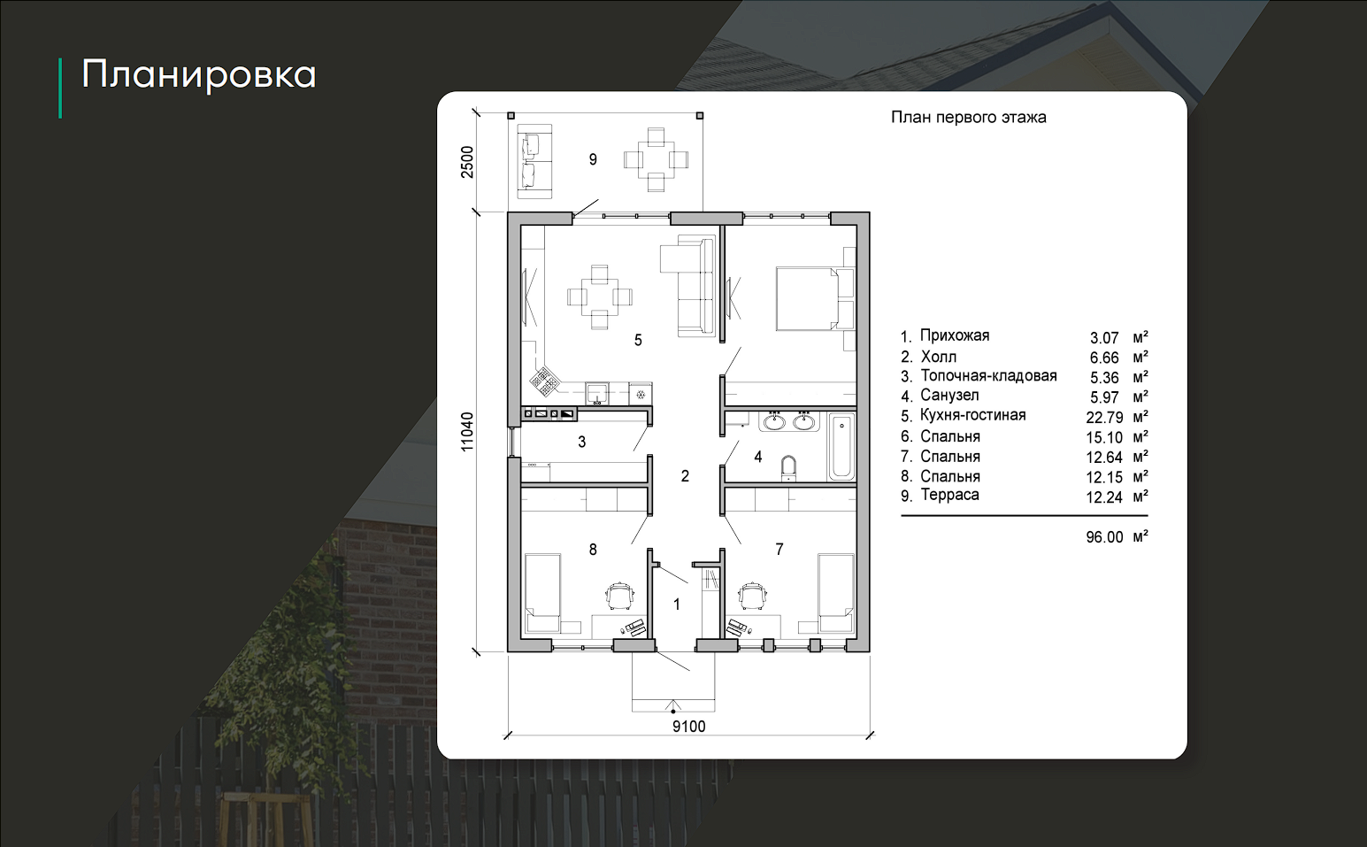 Размеры дома 9,1м х 11,04м = 100м2,