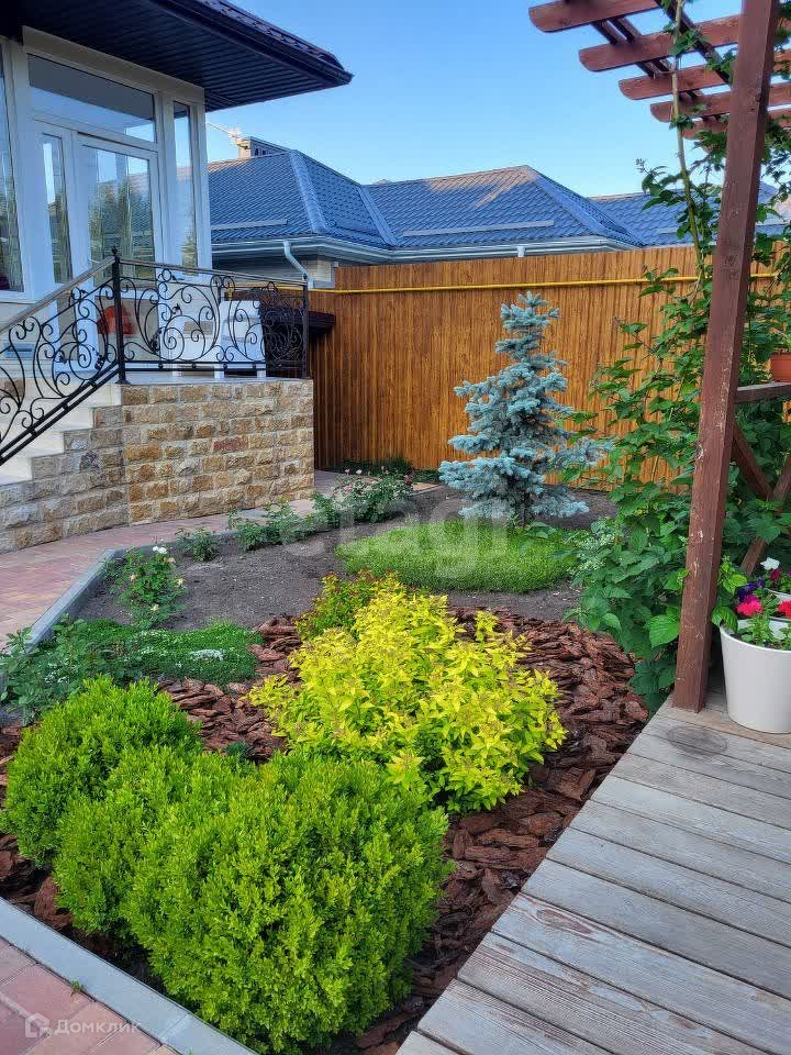 Приусадебный участок зонально разделен на две части: декоративная часть с деревьями, кустарниками и газоном, и садово- огородная с плодоносящими деревьями, везде смонтирована система автополива.