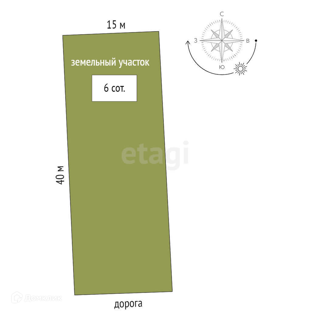 Участок 6 соток, прямоугольный, фасад 15 метров, в глубину 40 метров. По фасаду установлены кирпичные колонны под забор.