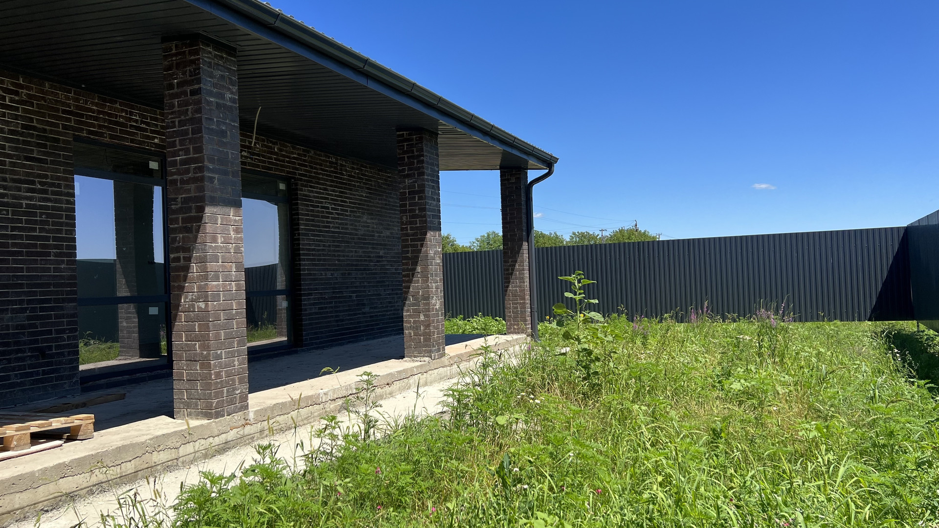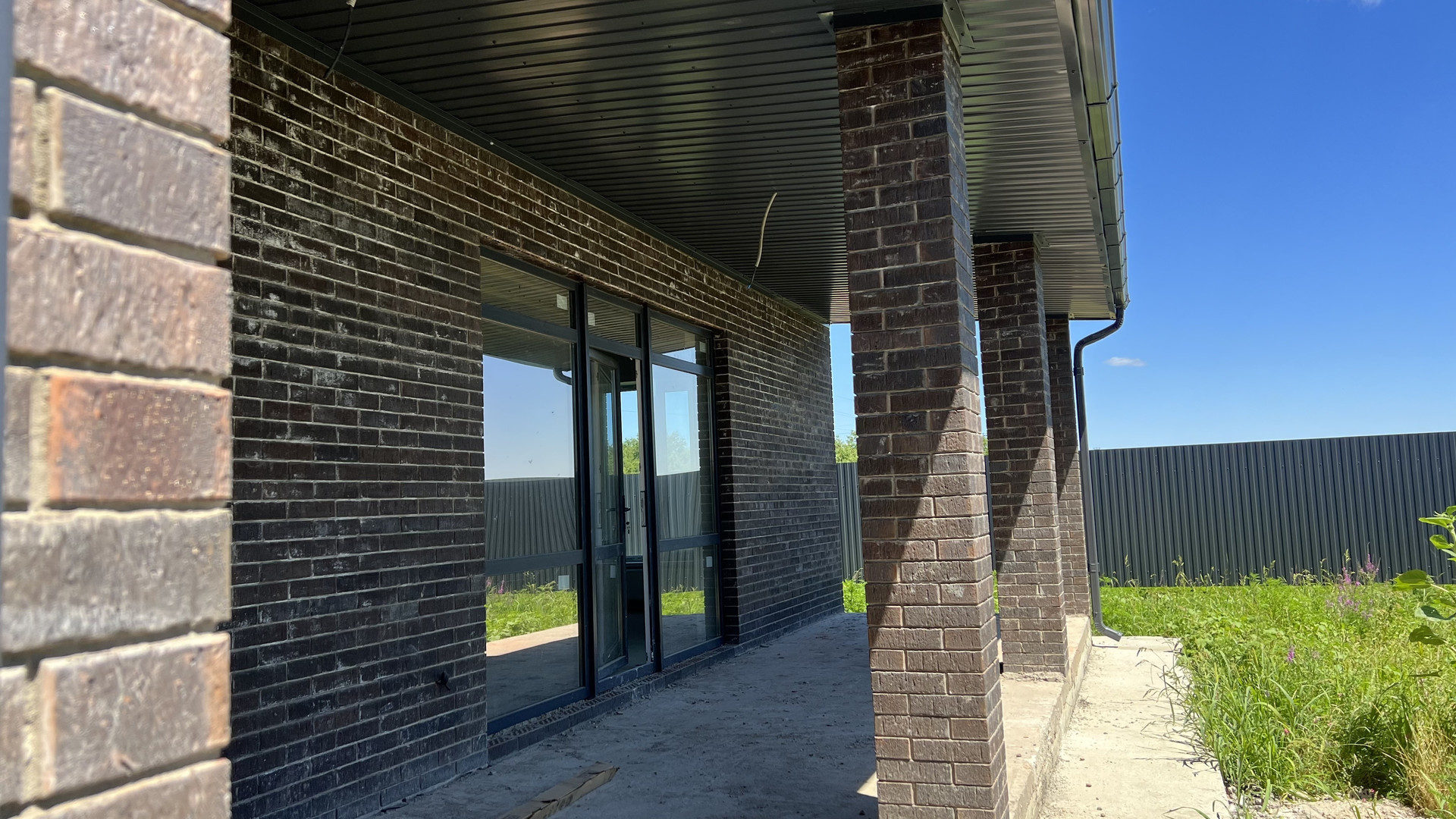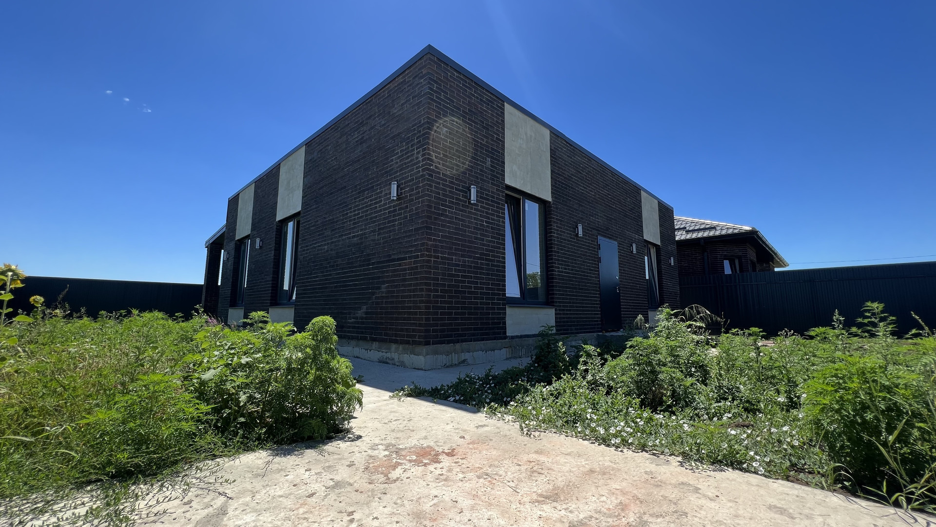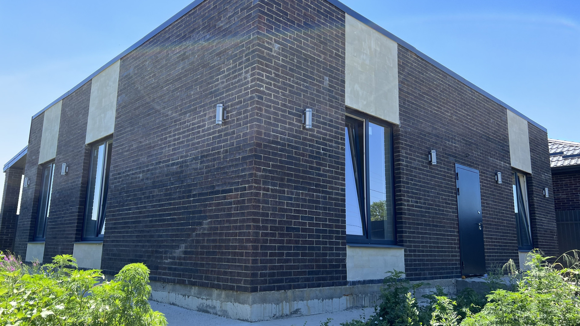 Одноэтажный коттедж возведен в современном архитектурном стиле лофт с использованием высококачественных строительных материалов: свайно-ростверковый фундамент, материал стен — газоблок 250 мм, утеплитель «Пеноплекс», наружные — облицовочный керамический славянский кирпич, плоская кровля — металлочерепица Grand Line, металлопластиковые окна GRUNBAU с внешней ламинацией, низким подоконником (французское остекление), качественные входные двери.