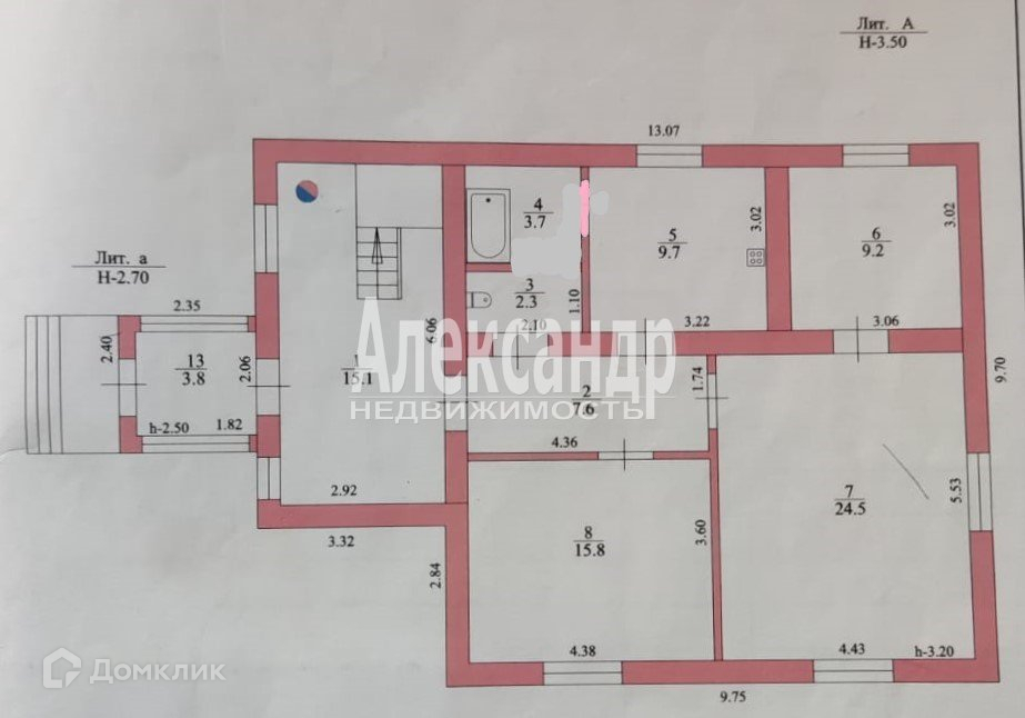 В доме на 1м эт: 3 комн с пот 3,5м, кухня 9,7 м2, совм санузел 6м2 с окном, холл 15,1 м2, на 2м манс эт: комната 22,3м2, комната с камином 13,1м2, большая лоджия с видом на реку.
