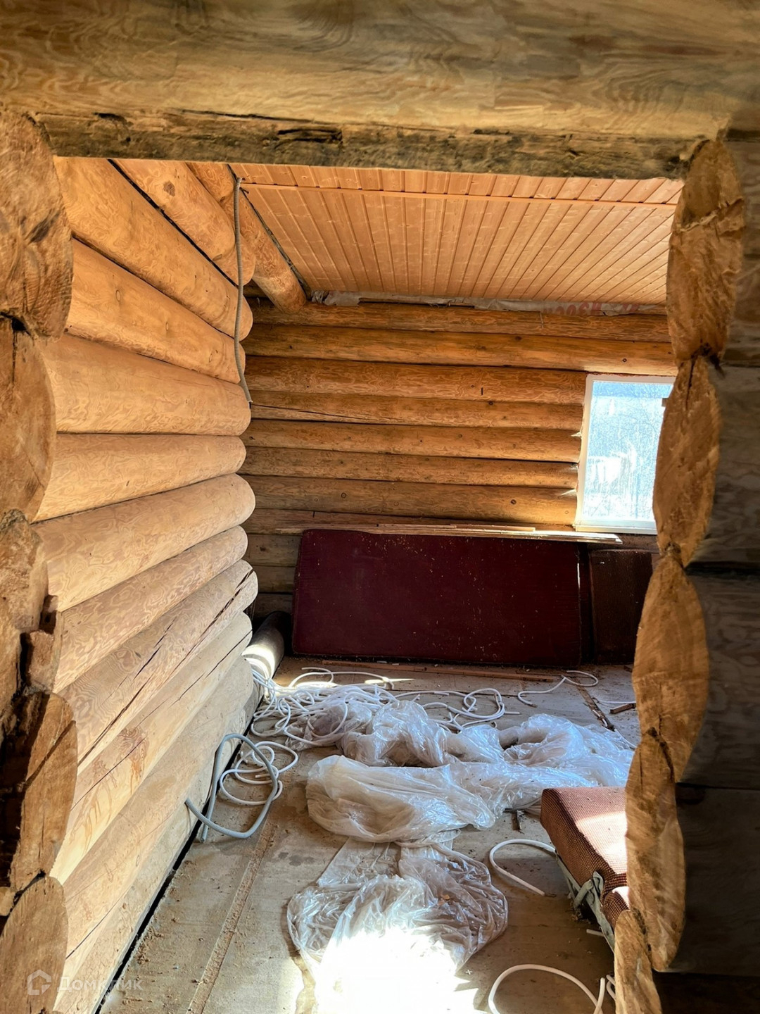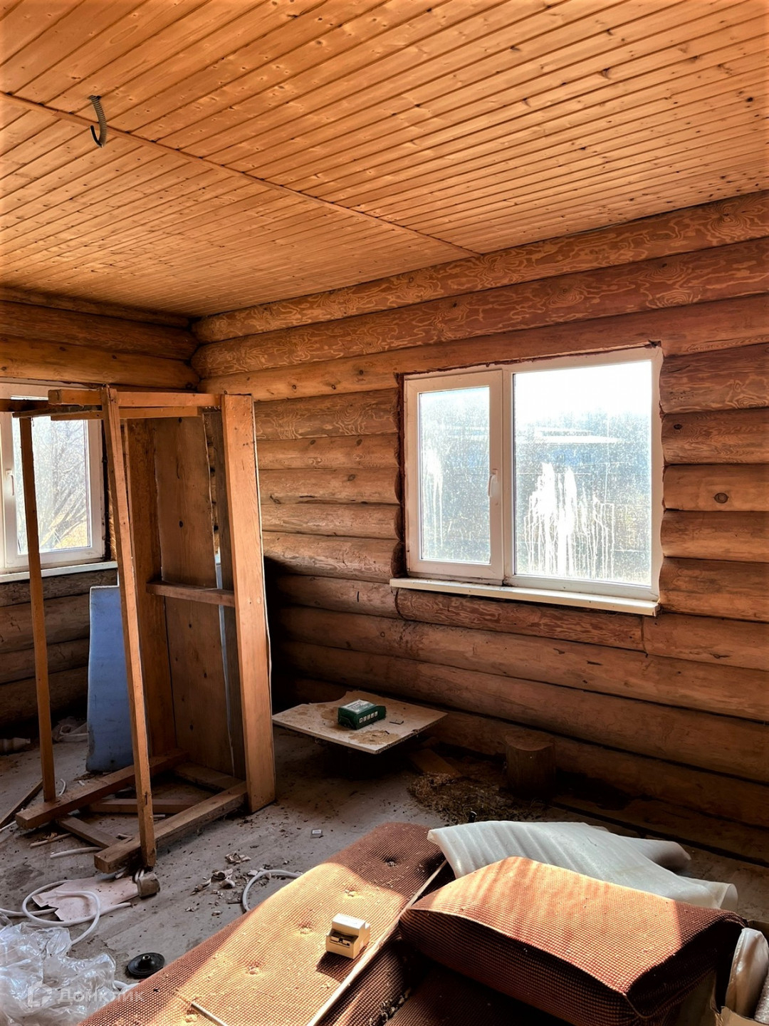 Отделка только деревом, в доме очень благоприятная атмосфера. Зимой тепло, летом прохладно, бревно 30 см.