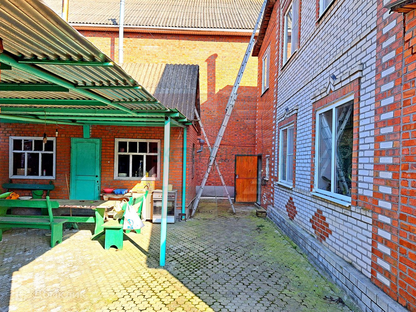 Двор вымощен плиткой и установлен навес.